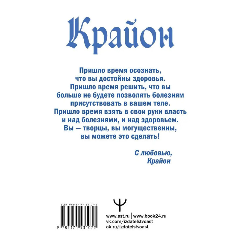 В этой книге Тамары Шмидт одного из самых известных ченнелеров России, вы найдете уникальные послания, в которых Крайон с любовью и заботой дает очень ценную информацию обо всем, что касается здоровья и избавления от болезней. Эти бесценные знания, конечно, не заменят консультаций и назначений врача, но позволят вам разобраться в своих недугах и их причинах, осознать неслучайность их появления в вашей жизни и найти свой собственный, уникальный, подходящий именно вам способ исцеления. Эта книга не содержит какой-то панацеи для всех людей. Но эти послания Крайона построены так, чтобы вы могли глубоко разобраться в себе, в своих недугах и их причинах и в результате найти свою собственную, уникальную, единственную в своем роде панацею. В посланиях, которые вы прочитаете в этой книге, Крайон дает полную, глубокую и систематизированную информацию обо всем, что касается болезней и исцеления. В этой книге есть информация именно для вас конкретно для вас, читающего сейчас эти строки. В этой книге есть тот способ