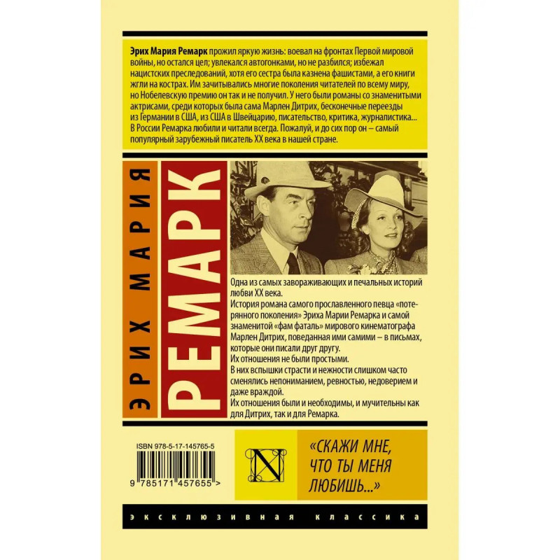 Одна из самых завораживающих и печальных историй любви ХХ мирового века. История романа самого прославленного певца "потерянного поколения" Эриха Марии Ремарка и самой знаменитой "фам фаталь" мирового кинематографа Марлен Дитрих, поведанная ими самими в письмах, которые они писали друг другу. Их отношения не были простыми. В них вспышки страсти и нежности слишком часто сменялись непониманием, ревностью, недоверием и даже враждой. Их отношения были и необходимы, и мучительны как для Дитрих, так и для Ремарка. Они должны были закончиться пл.оxо и закончились пл.оxо. Но и сейчас письма великого писателя и гениальной актрисы трогают до глубины души...