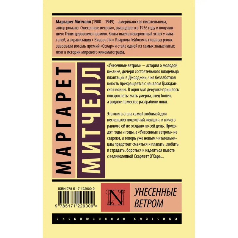 Маргарет Митчелл (19 - 1949) - американская писательница, автор романа "Унесённые ветром", вышедшего в 1936 году и получившего Пулитцеровскую премию. Книга имела невероятный успех у читателей, а экранизация с Вивьен Ли и Кларком Гейблом в главных ролях завоевала восемь премий "Оскар" и стала одной из самых знаменитых лент в истории мирового кинематографа. "Унесенные ветром" - история о молодой южанке, дочери состоятельного владельца плантаций в Джорджии, чья беззаботная юность прекращается с началом Гражданской войны. В один миг девушке пришлось повзрослеть: мать умерла, отец болен, а родное поместье разграбили янки. Эта книга стала самой любимой для нескольких поколений женщин, и ничего равного ей не создано по сей день. Проходят годы и годы, а "Унесенные ветром" не стареют, и теперь уже новым читательницам предстоит смеяться и плакать, любить и страдать, бороться и надеяться вместе с великолепной Скарлетт ОХара...