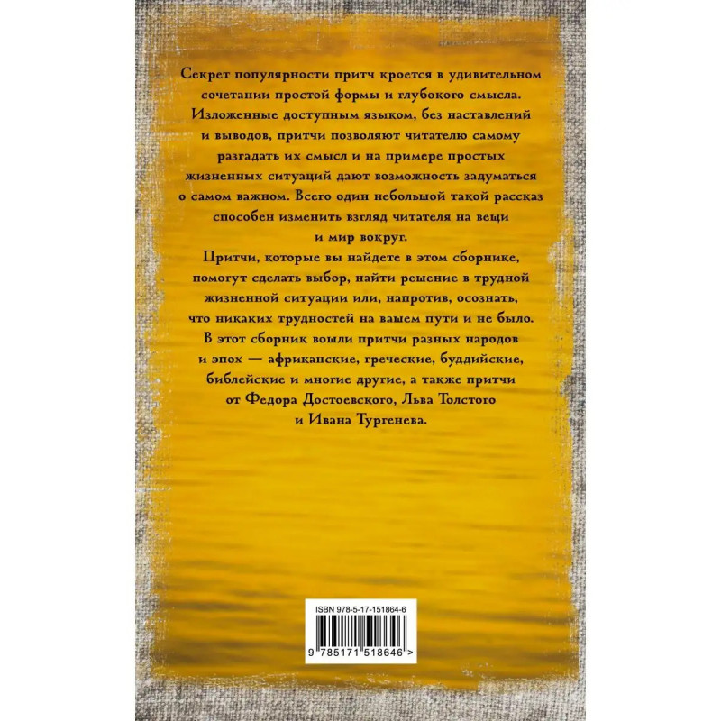 Секрет популярности притч кроется в удивительном сочетании простой формы и глубокого смысла. Изложенные доступным языком, без наставлений и выводов, притчи позволяют читателю самому разгадать их смысл и на примере простых жизненных ситуаций дают возможность задуматься о самом важном. Всего один небольшой такой рассказ способен изменить взгляд читателя на вещи и мир вокруг. Притчи, которые вы найдете в этом сборнике, помогут сделать выбор, найти решение в трудной жизненной ситуации или, напротив, осознать, что никаких трудностей на вашем пути и не было. В этот сборник вошли притчи разных народов и эпох африканские, греческие, буддийские, библейские и многие другие, а также притчи от Федора Достоевского, Льва Толстого и Ивана Тургенева.