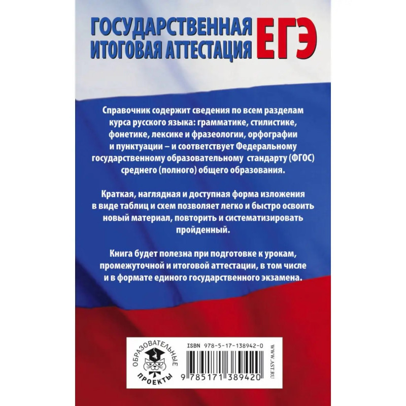 Справочник содержит сведения по всем разделам курса русского языка: грамматике, стилистике, фонетике, лексике и фразеологии, орфографии и пунктуации и соответствует Федеральному государственному образовательному (ФГОС) среднего (полного) общего образования. Краткая, наглядная и доступная форма изложения в виде таблиц и схем позволяет легко и быстро освоить новый материал, повторить и систематизировать пройденный. Книга будет полезна при подготовке к урокам, промежуточной и итоговой аттестации, в том числе и в формате единого государственного экзамена.