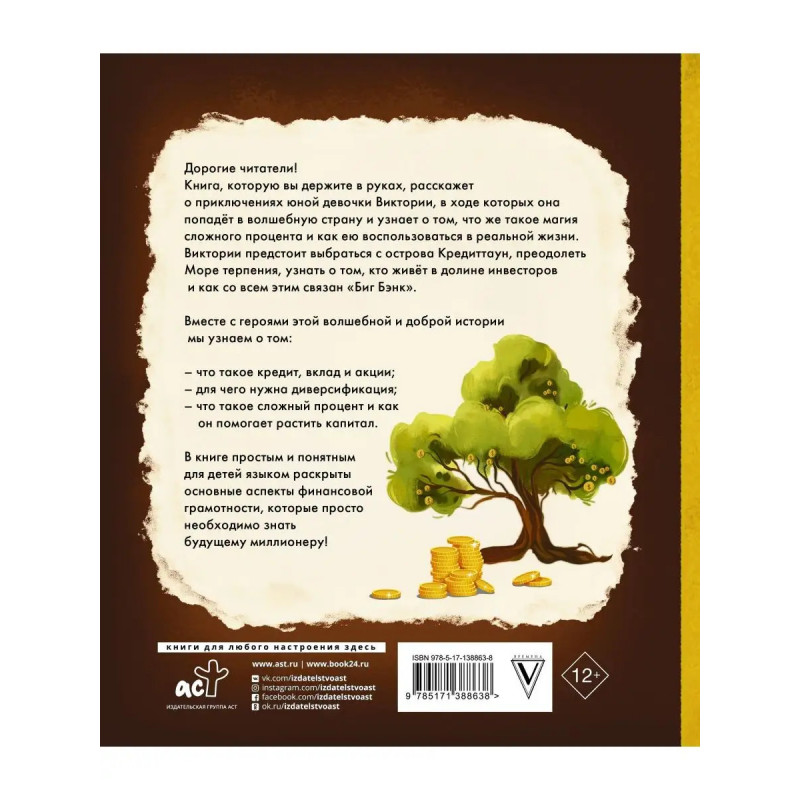 Эта детская книга познакомит маленького читателя с азами финансовой грамотности. Благодаря ней ребёнок задумается о разумном отношении к деньгам и их возможностям. Вместе с Викторией ваш будущий миллионер сделает первый шаг к тому, чтобы впоследствии собирать плоды с собственных финансовых деревьев! Автор книги Рустем Ишмаков, предприниматель и практикующий частный инвестор со стажем, разаработчик уникальных стратегий инвестирования, создатель образовательного финансового канала FinanceGramm.