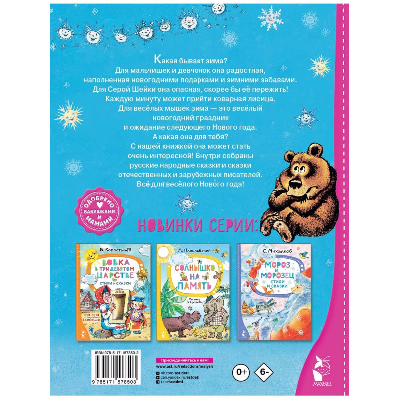 Зимние сказки. Какая бывает зима? Для мальчишек и девчонок она радостная, наполненная новогодними подарками и зимними забавами. Для Серой Шейки она опасная, скорее бы её пережить! Каждую минуту может прийти коварная лисица. Для весёлых мышек зима - это весёлый новогодний праздник и ожидание следующего Нового года. А какая она для тебя? С нашей книжкой она может стать очень интересной! Внутри собраны русские народные сказки и сказки отечественных и зарубежных писателей. Всё для весёлого Нового года!