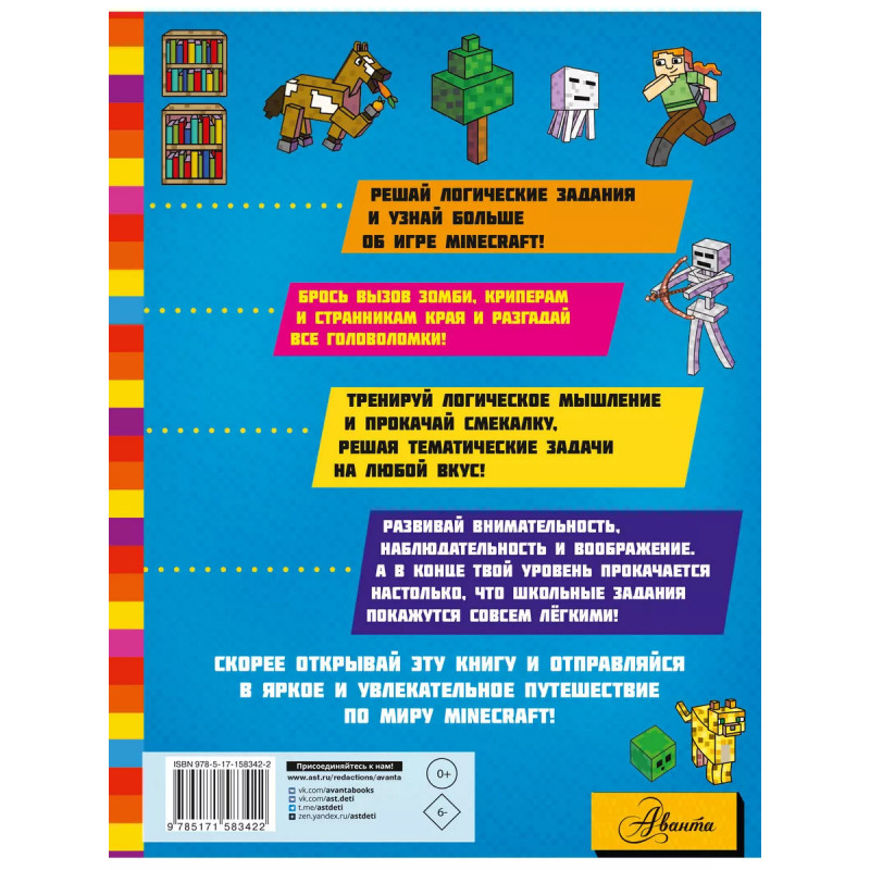 MINECRAFT. Большая книга логических заданий и игр для майнкрафтеров. Решай логические задания и узнай больше об игре Minecraft! Брось вызов зомби, криперам и странникам Края и разгадай все головоломки! Тренируй логическое мышление и прокачай смекалку, решая тематические задачи на любой вкус! Развивай внимательность, наблюдательность и воображение. А в конце твой уровень прокачается настолько, что школьные задания покажутся совсем лёгкими! Скорее открывай эту книгу и отправляйся в яркое и увлекательное путешествие по миру Minecraft!