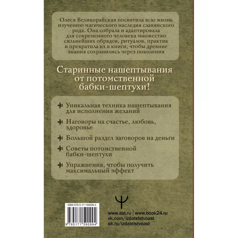 Книга старинных нашептываний. Как просить, чтобы дано было. Сильные заговоры бабки-шептухи на деньги. Древний метод заговора - шепоток, поможет вам донести свои просьбы до Высших сил. Эта техника считается одной из самых эффективных для получения желаемого. В книге вы найдете уникальные, очень сильные старинные заговоры от потомственной бабки-шептухи на деньги, здоровье, счастье, любовь и удачу. А обучиться древнему русскому искусству нашептывания, чтобы получать максимальный эффект, помогут специальные упражнения. Отдельный большой раздел книги посвящен заговорам на деньги. Это настоящая магия слов, которая творит чудеса!