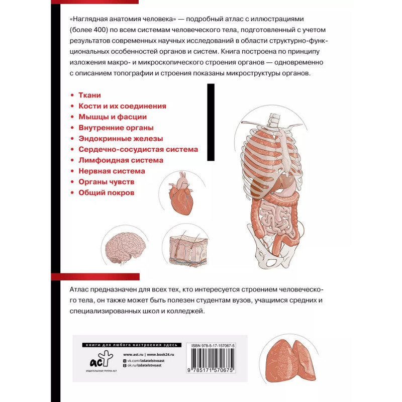 Наглядная анатомия человека. Подробный атлас с иллюстрациями. Настоящая книга представляет собой подробный атлас, содержащий более 4 цветных иллюстраций по всем системам человеческого тела: ткани, кости и их соединения, мышцы и фасции, внутренние органы, эндокринные железы, сердечно-сосудистая, лимфоидная, нервная системы, органы чувств и общий покров. В конце атласа приводятся основные анатомические понятия. Книга построена по принципу изложения макро- и микроскопического строения органов. Одновременно с описанием топографии и строения органов показаны микроструктуры паренхимы и стромы стенок пищеварительного тракта, дольки легкого, почки, яичка и яичника, надпочечников, лимфатического узла, костного мозга, центральной нервной системы и т. д. Атлас предназначен для всех тех, кто интересуется строением человеческого тела, он также может быть полезен студентам медицинских учебных заведений, биологических факультетов, учащимся средних и специализированных школ и колледжей.
