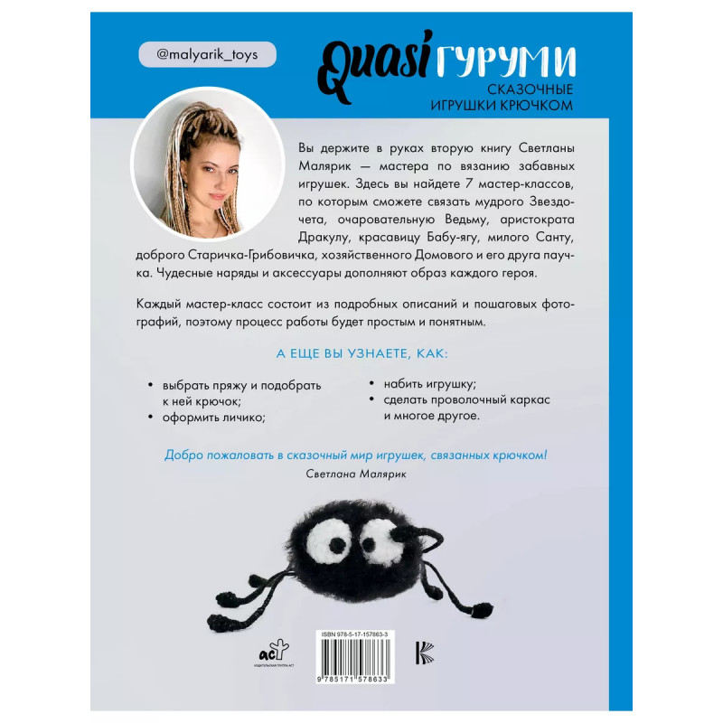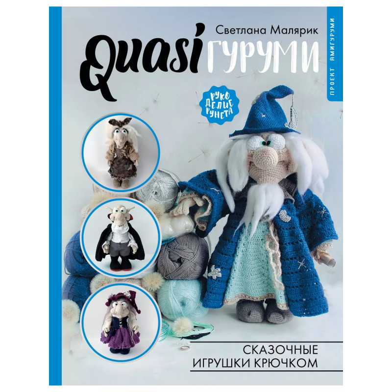 QUASIгуруми. Сказочные игрушки крючком. Проект амигуруми. Светлана Малярик - мастер по вязанию забавных игрушек, и это ее вторая книга. Здесь вы найдете 7 мастер-классов, по которым сможете связать мудрого Звездочета, очаровательную Ведьму, аристократа Дракулу, красавицу Бабу-ягу, милого Санту, доброго Старичка-Грибовичка, хозяйственного Домового и его друга паучка. Чудесные наряды и аксессуары доволняют образ каждого героя. Каждый мастер-класс состоит из подробных описаний и пошаговых фотографий, процесс работы будет простым и понятным. А еще вы узнаете, как выбрать пряжу и подобрать к ней крючок, оформить личико, набить игрушку, сделать проволочный каркас и многое другое.