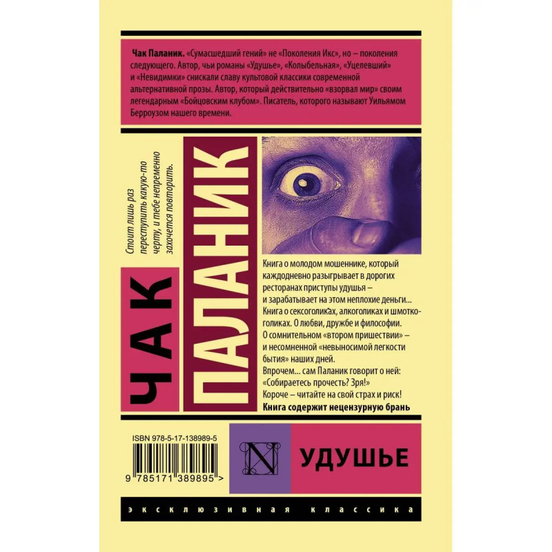 Чак Паланик. "Сумасшедший гений" не "Поколения Икс", но поколения СЛЕДУЮЩЕГО. Автор, чьи романы "Удушье", "Колыбельная", "Уцелевший" и "Невидимки" снискали славу КУЛЬТОВОЙ классики современной альтернативной прозы. Автор, который ДЕЙСТВИТЕЛЬНО "взорвал мир" своим легендарным "Бойцовским клубом". Чак Паланик. Писатель, которого уже называют Уильямом Берроузом нашего времени. Книга о молодом мошеннике, который каждодневно разыгрывает в дорогих ресторанах приступы удушья и зарабатывает на этом непл.оxие деньги... Книга о сексоголиках, алкоголиках и шмоткаголиках. О любви, о дружбе и философии. О сомнительном "втором пришествии" и несомненной "невыносимой легкости бытия" наших дней. Впрочем, сам Паланик говорит о своем романе: "Собираетесь прочитать? И зря!" Однако прочитать все же стоит на свой страх и риск!