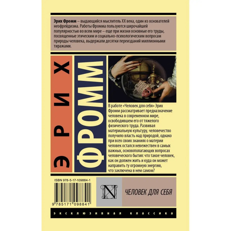 В работе "Человек для себя" Эрих Фромм рассматривает предназначение человека в современном мире, освободившем его от тяжелого физического труда. Развивая материальную культуру, человечество получило власть над природой, однако при всех своих знаниях о материи человек остался невежественен в самых важных, основополагающих вопросах человеческого бытия: что такое человек, как он должен жить и куда он может направить ту огромную энергию, что заключена в нем самом?