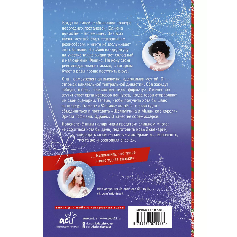 В Мышином Королевстве. - Новинка серии издательства АСТ "Зимняя романтика". Романтическая комедия из тех, что заряжают предновогодним настроением и чудесным чувством предвкушения праздника. - Нетривиальный сюжет, разворачивающийся вокруг постановки знаменитого гофмановского "Щелкунчика". Загляните за кулисы легендарной сказки, постановку которой хотя бы раз в жизни видел каждый. - Для всех поклонников тропа "от ненависти до любви" и историй, которые рассказывают интересное об искусстве. Бажена и Феликс мечтают о режиссерской карьере. А потому, когда стартует конкурс, приз в котором - рекомендация в вуз, бросаются участвовать. Увы, обоих ждет неудача - организаторы не в восторге от их чересчур креативных сценариев. Последняя надежда - поставить "Щелкунчика", но для этого придется работать сообща. Надменная выскочка Божена и хмурый потомок театральной династии Феликс - напарники так себе. Однако им придется усмирить нрав, ведь новогоднее настроение, как известно, не терпит козней и ссор.