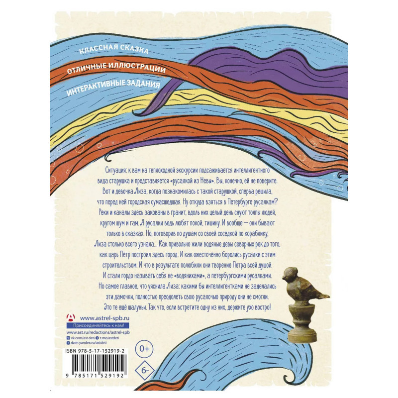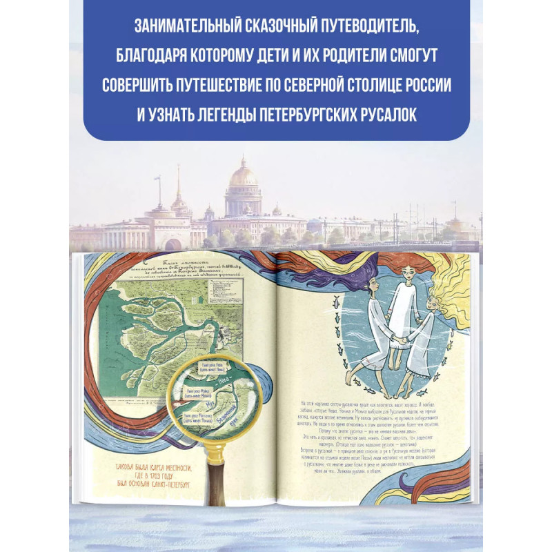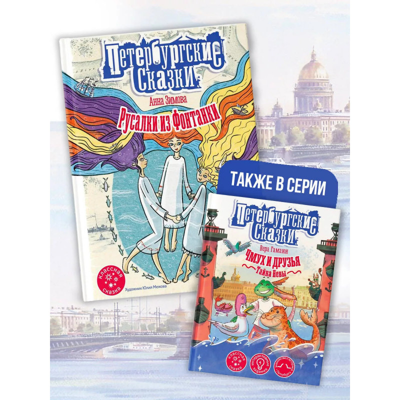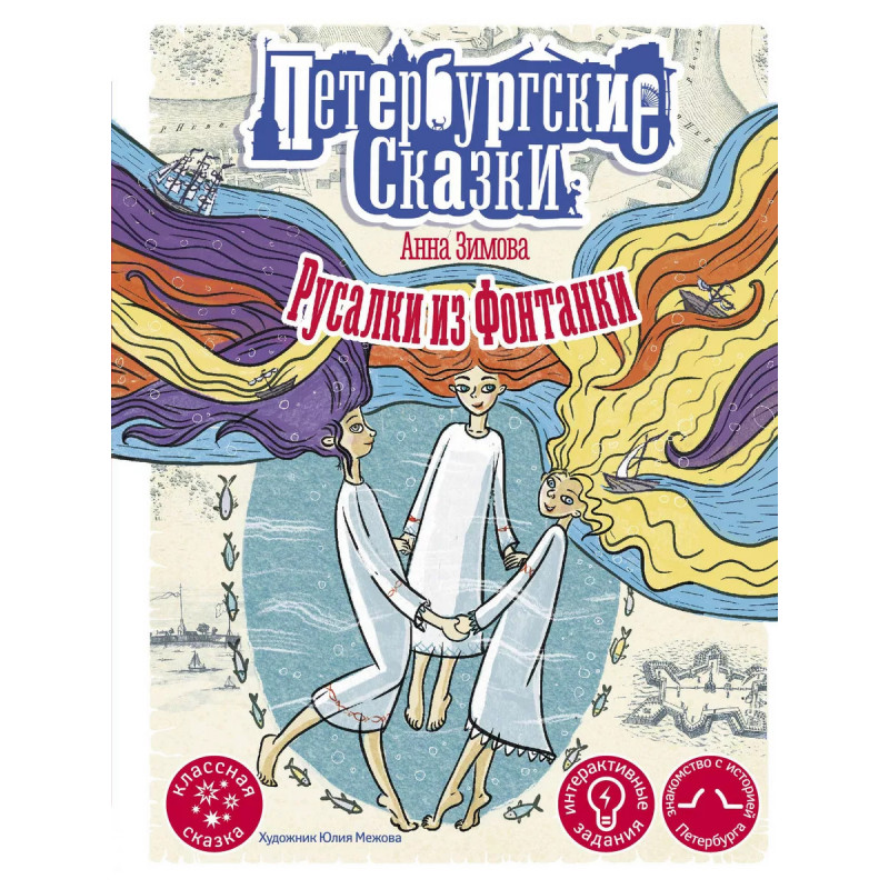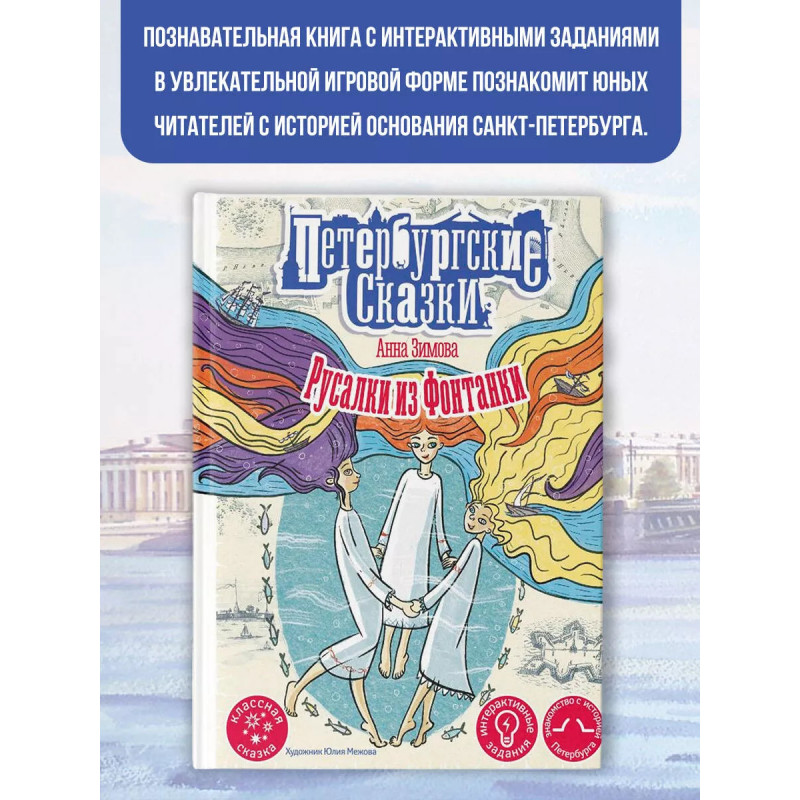Русалки из Фонтанки. Познавательная интерактивная книга-сувенир в увлекательной игровой форме познакомит маленьких читателей с историей основания Санкт-Петербурга. Вместе с настоящей русалкой вы совершите невероятное путешествие по рекам и каналам Северной Венеции и не только узнаете много нового о Петербурге, но и выясните, где живут и чем занимаются современные русалки, Итак, вперёд, навстречу приключениям (и новым знаниям)!