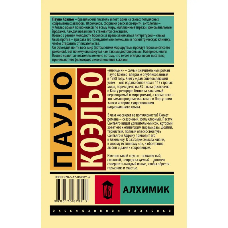 Алхимик" самый известный роман бразильского писателя Пауло Коэльо, любимая книга миллионов людей во всем мире. В юности люди не боятся мечтать, все кажется им возможным. Но проходит время, и таинственная сила принимается им внушать, что их желания неосуществимы. "Добиться воплощения своей Судьбы вот единственная подлинная обязанность человека", утверждает Пауло Коэльо. Этот, ставший культовым, роман-притча способен изменить жизнь своих читателей.