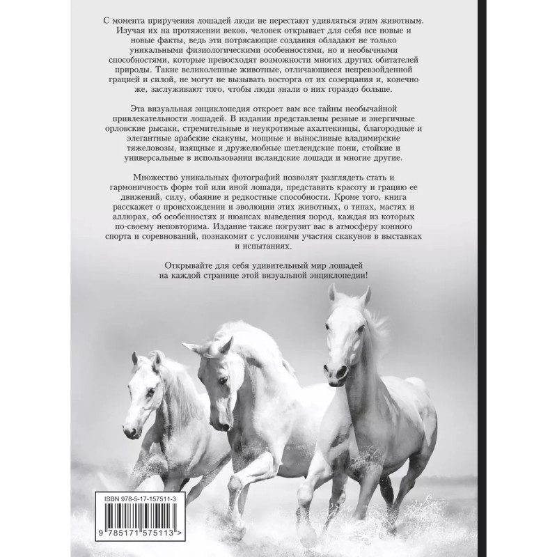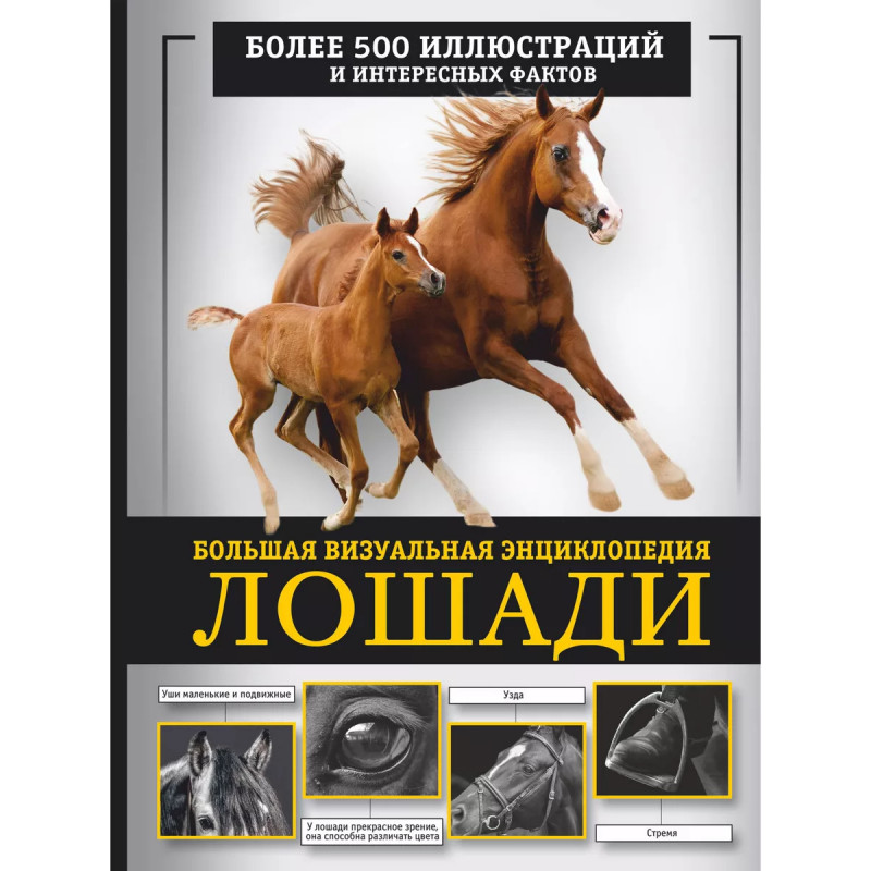 Лошади. Большая визуальная энциклопедия. В этой иллюстрированной энциклопедии собраны все самые интересные факты и зрелищные фотографии, посвященные сильным и красивым, стремительным и неукротимым, благородным и элегантным животным - лошадям. Вы сможете познакомиться с историей их происхождения и эволюцией, разнообразием пород и разновидностей, узнать о конном спорте и скачках. Вас ждет не только увлекательное чтение, но и визуальное погружение в мир этих прекрасных существ. Каждая страница книги буквально оживает благодаря красочным и живописным изображениям, на которых запечатлены волшебные моменты скачек, блестящие выступления на конных соревнованиях, гармоничное взаимодействие с людьми, спокойные пастбища и вольные просторы, где животные обретают свободу и особенную привлекательность. Данная энциклопедия станет незаменимым справочником для всех любителей лошадей, будь то профессионалы в этой области или просто увлеченные энтузиасты. Вы не только расширите свои знания об этих животных, но и оцените грацию, ум и преданность удивительных созданий,