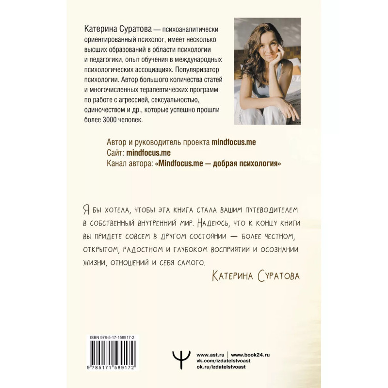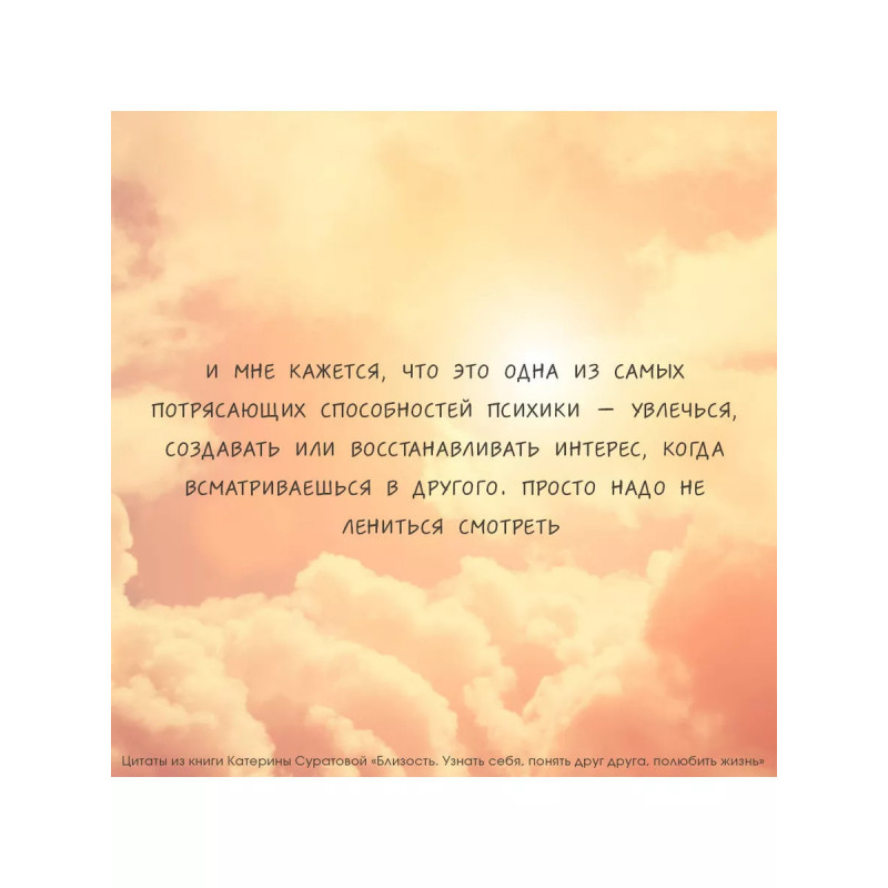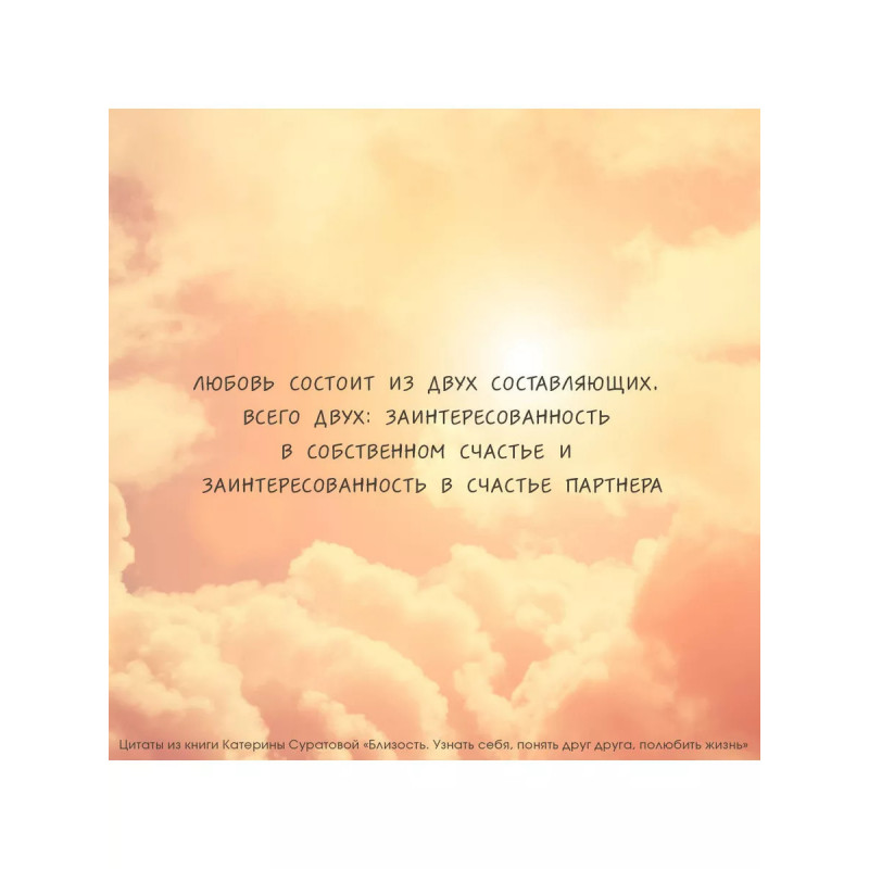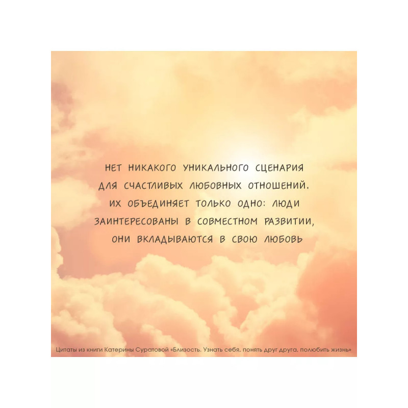 Близость. Узнать себя, понять друг друга, полюбить жизнь. Сложно ли вам с самим собой? А с другими? Вы удивитесь, но отношения с другими людьми напрямую зависят от отношений с собой. Если вы уважаете и любите, принимаете себя, прислушиваетесь, внимательны к себе, то такое же отношение получают от вас и ваши близкие. Близость с собой является основой для здоровой и счастливой близости с другими. Если вы испытываете трудности в отношениях с другими и связь с собой нарушена, вам поможет книга психолога Катерины Суратовой "Близость. Узнать себя, понять друг друга, полюбить жизнь". В книге Катерина рассказывает истории пациентов из личной практики. Через эти истории вы ясно увидите и свои трудности, а практики и упражнения укажут вам путь исцеления. Вы начнете прорабатывать травмы из детства и укоренившиеся негативные установки, откроетесь себе, близким и миру; начнете любить и ценить себя и свою жизнь.