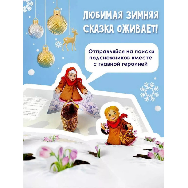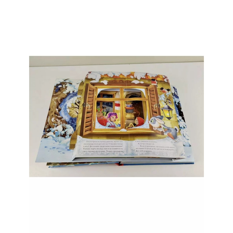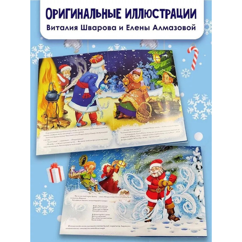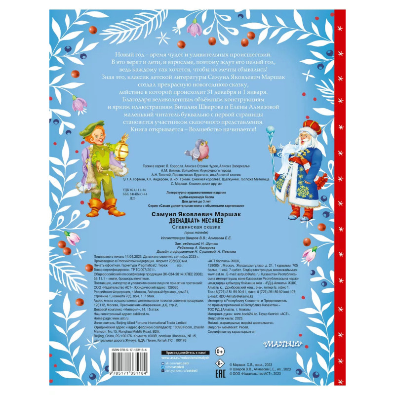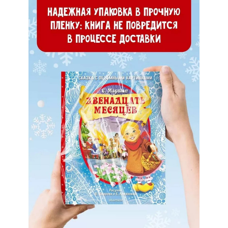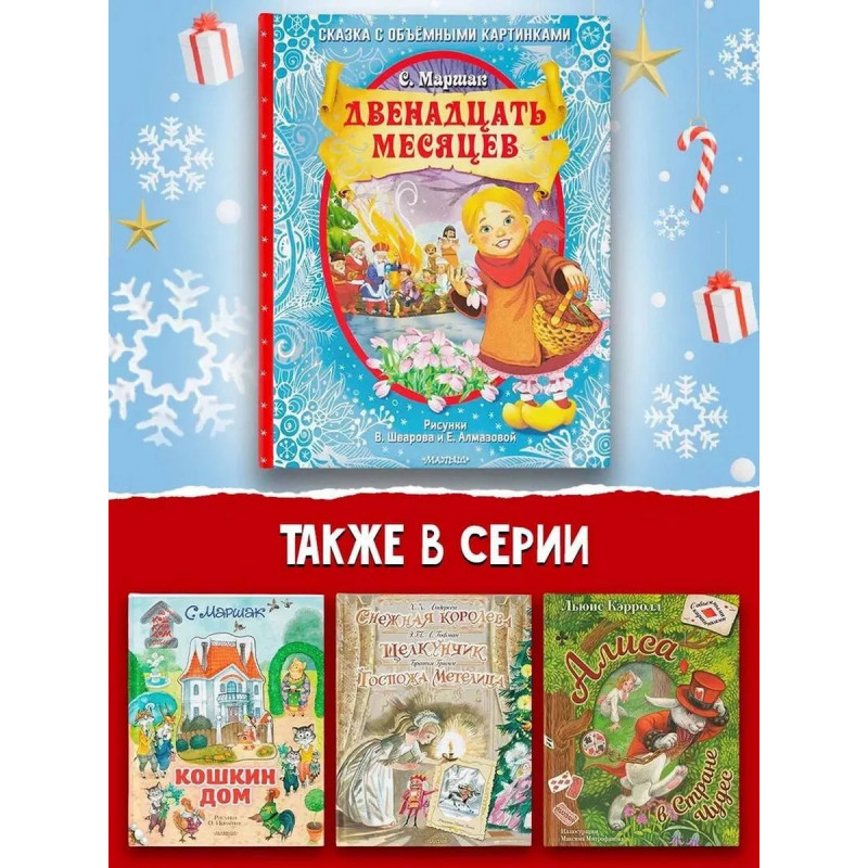 Двенадцать месяцев (славянская сказка). Рис. В. Шварова и Е. Алмазовой. Новый год - время чудес и удивительных происшествий. В это верят и дети, и взрослые, поэтому ждут его целый год, ведь каждому так хочется, чтобы их мечты сбывались! Зная это, классик детской литературы Самуил Яковлевич Маршак создал прекрасную новогоднюю сказку, действие в которой происходит 31 декабря и 1 января. Благодаря великолепным объёмным конструкциями и ярким иллюстрациям Виталия Шварова и Елены Алмазовой маленький читатель буквально с первой страницы становится участником сказочного представления. Книга открывается - волшебство начинается!