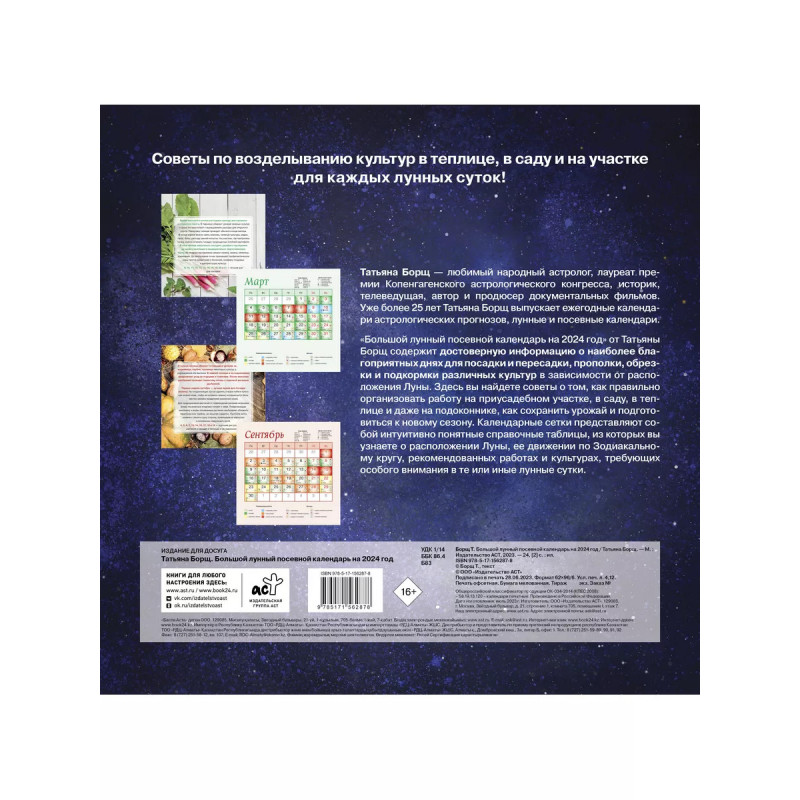 Большой лунный посевной календарь на 2024 год. Татьяна Борщ - любимый народный астролог, лауреат премии Копенгагенского астрологического конгресса, историк, телеведущая, автор и продюсер документальных фильмов. Уже более 25 лет Татьяна Борщ выпускает ежегодные календари астрологических прогнозов, лунные и посевные календари. "Большой лунный посевной календарь на 224 год" от Татьяны Борщ содержит достоверную информацию о наиболее благоприятных днях для посадки и пересадки, прополки, обрезки и подкормки различных культур в зависимости от расположения Луны. Здесь вы найдете советы о том, как правильно организовать работу на приусадебном участке, в саду, в теплице и даже на подоконнике, как сохранить урожай и подготовиться к новому сезону. Календарные сетки представляют собой интуитивно понятные справочные таблицы, из которых вы узнаете о расположении Луны, ее движении по зодиакальному кругу, рекомендованных работах и культурах, требующих особого внимания в те или иные лунные сутки.