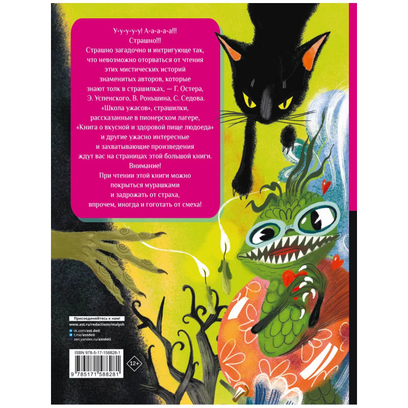 Все-все-все страшные истории для детей. У-у-у-у-у! А-а-а-а-а!!! Страшно!!! Страшно загадочно и интригующе так, что невозможно оторваться от чтения этих мистических историй знаменитых авторов, которые знают толк в страшилках, - Г. Остера, Э. Успенского, В. Роньшина, С. Седова. "Школа ужасов", страшилки, рассказанные в пионерском лагере, "Книга о вкусной и здоровой пище людоеда" и другие ужасно интересные и захватывающие произведения ждут вас на страницах этой большой книги. Внимание! При чтении этой книги можно покрыться мурашками и задрожать от страха, впрочем, иногда и гоготать от смеха!