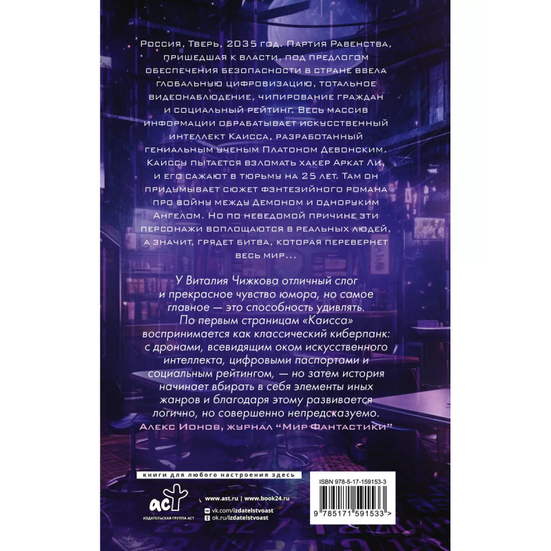 Каисса. Для поклонников бестселлера "МЕТРО 233"! Погрузитесь в мир, где искусственный интеллект контролирует каждое ваше действие, а грани реальности и фантазии стираются. В 235 году Россия становится ареной грандиозного столкновения: тоталитарная система и бунтующий хакер, а между ними - персонажи фэнтезийного романа, ставшие живой реальностью. "Каисса" Виталия Чижкова - это захватывающая, местами философская история, в которой научная фантастика причудливо сплетается с мистикой, а живой язык заставит прочесть все на одном дыхании.