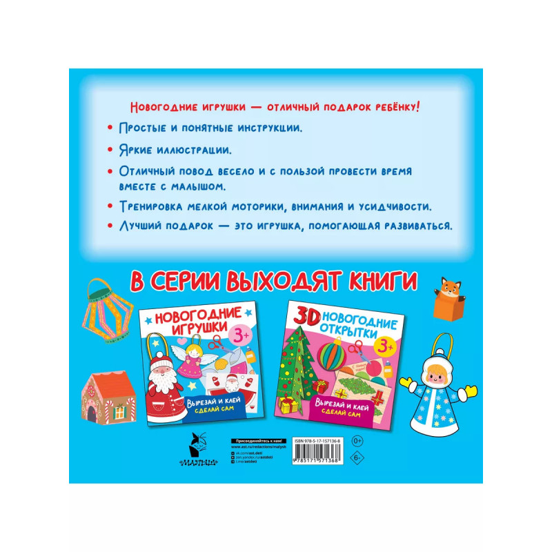 Новогодние игрушки. Вырезай и клей. Сделай сам. Новый год ещё не наступил, а у вас уже есть подарок для ребёнка! Ярко иллюстрированная книга "Новогодние игрушки. Вырезай и клей. Сделай сам" с подробными и понятными инструкциями обязательно увлечёт вашего малыша. Мы предлагаем вашему вниманию поделки разных уровней сложности: с одними ребёнок успешно справится сам, другие станут отличным поводом весело и с пользой провести время вместе с малышом. Представьте, как будет рад и горд ваш ребёнок, увидев свою игрушку на ёлочке. Фигурки Деда Мороза и Снегурочки, новогодняя ёлочка и праздничный фонарик, рождественский ангел и пряничный человечек И даже пальчиковый театр! Лучший подарок детям - это игрушка, помогающая развиваться. Задания в нашей книге тренируют мелкую моторику, внимание, усидчивость, активизируют воображение и фантазию, развивают художественный вкус и любовь к творчеству. Формат книги - "волшебный квадрат". Создайте вместе с ребёнком новогоднюю атмосферу в доме!
