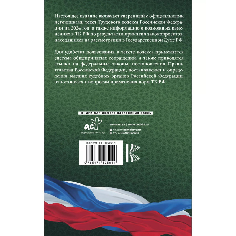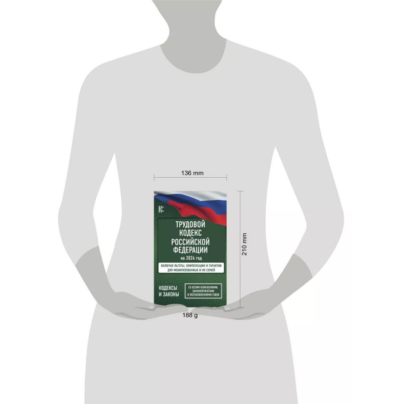 Трудовой Кодекс Российской Федерации на 2024 год. Включая льготы, компенсации и гарантии для мобилиз. Данное издание Трудового кодекса Российской Федерации сверено с официальным источником и приводится по состоянию на 224 год. Кодекс учитывает все изменения, опубликованные в официальных источниках на момент подписания издания в печать. В издании представлена информация о возможных изменениях в ТК РФ по результатам принятия законопроектов, находящихся на рассмотрении в Государственной Думе РФ. Для удобства пользования в тексте кодекса применяется система общепринятых сокращений, а также приводятся ссылки на федеральные законы, постановления Правительства Российской Федерации, постановления и определения высших судебных органов Российской Федерации, относящиеся к вопросам применения норм ТК РФ.
