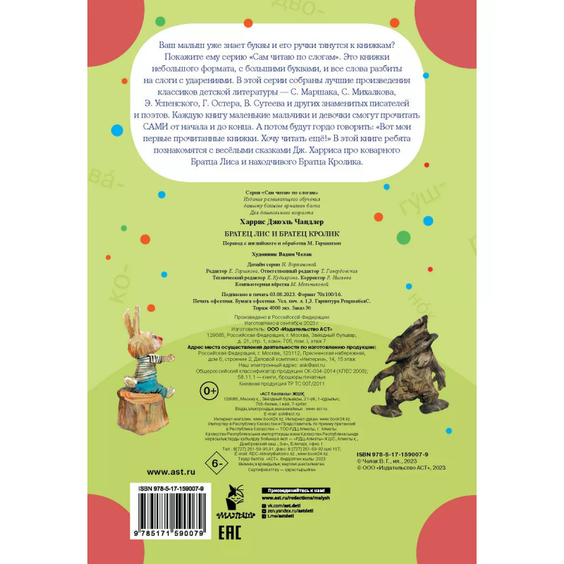 Братец Лис и братец Кролик. Крупный шрифт, разбивка на слоги, ударения, запоминающиеся цветные иллюстрации - в книгах серии "Сам читаю по слогам" есть всё необходимое для формирования у ребенка прочного навыка чтения и стимулирования устойчивого интереса к книге. А еще это прекрасная возможность познакомиться с лучшими произведениями любимых детских авторов, многие из которых стали неотъемлемой частью отечественной культуры. Знать их - признак образованного, культурного человека. Идеальное сочетание "цена-качество! Книги не будут обременительны для семейного бюджета и принесут массу пользы, создадут прекрасное настроение. Весёлые сказки Дж. Харриса про коварного Братца Лиса и находчивого Братца Кролика обязательно понравятся вашему малышу.