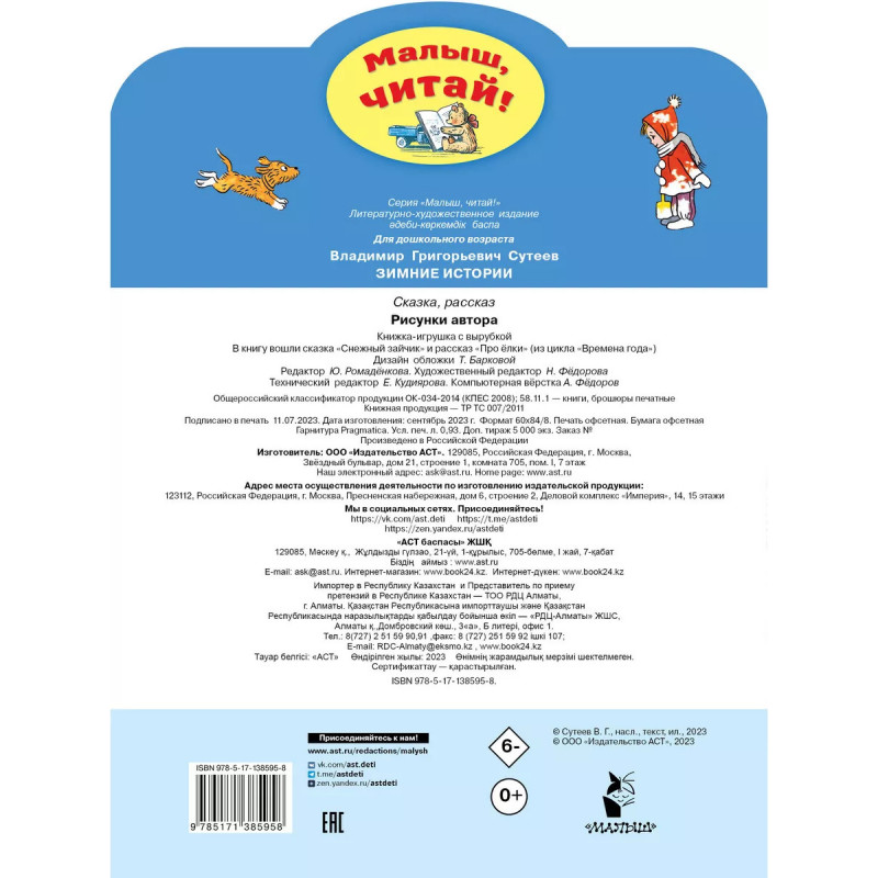 Зимние истории. Рисунки В. Сутеева. Владимир Григорьевич Сутеев одинаково владел и правой и левой рукой. Правой он писал увлекательные истории, а левой рисовал к ним картинки. В нашу книжку вошла новогодняя история про Машу и Ваню Кнопочкиных и сказка "Снежный зайчик". Малыши вместе со сказочными героями В. Сутеева встретят Новый год и научатся лепить необычных снеговиков. Сказка "Снежный зайчик" публикуется впервые за последние 5 лет. Для дошкольного возраста.