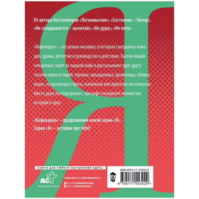 Кофеварка. - Ринат Валиуллин - поэт, писатель и филолог, автор популярных бестселлеров об отношениях между мужчиной и женщиной. - Продолжение авторской серии "Я": "Это истории про тебя", - говорит своим поклонницам Ринат Валиуллин. - Суммарный тираж книг писателя уже более 25 экземпляров! - Как известный знаток девичьих душ и грёз автор гарантирует незабываемое впечатление от каждой истории сборника и полное погружение в фантазии, служащие читателям зеркалом. - Каждая книга Рината Валиуллина - это кладезь остроумных цитат. Это поэтично написанная проза, сложные, но легко воспринимаемые сюжеты с безграничностью и многогранностью форм.