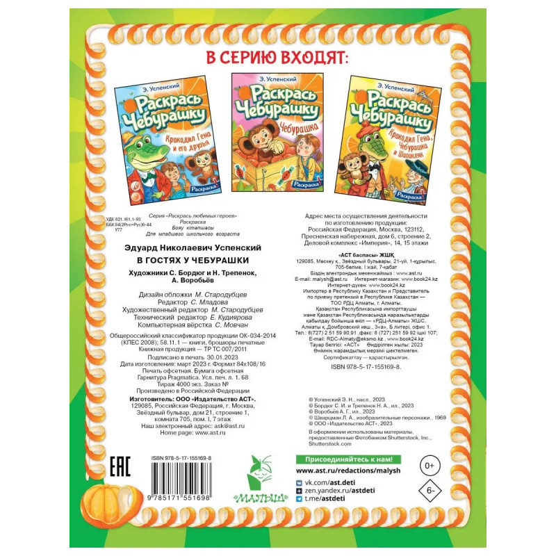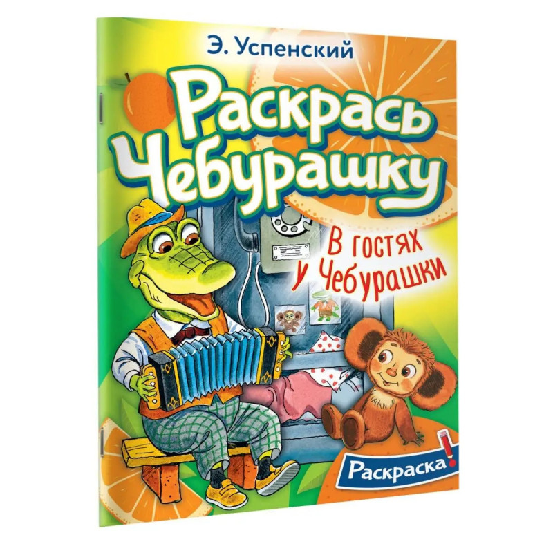 В раскраске В гостях у Чебурашки дети познакомятся с неизвестным науке зверем Чебурашкой и его друзьями: крокодилом Геной, жирафой Анютой, девочкой Галей, а также с беспокойной бабушкой Шапокляк и её подружкой ручной крысой. Раскрашивать Чебурашку и его друзей можно карандашами и фломастерами. Для младшего школьного возраста.