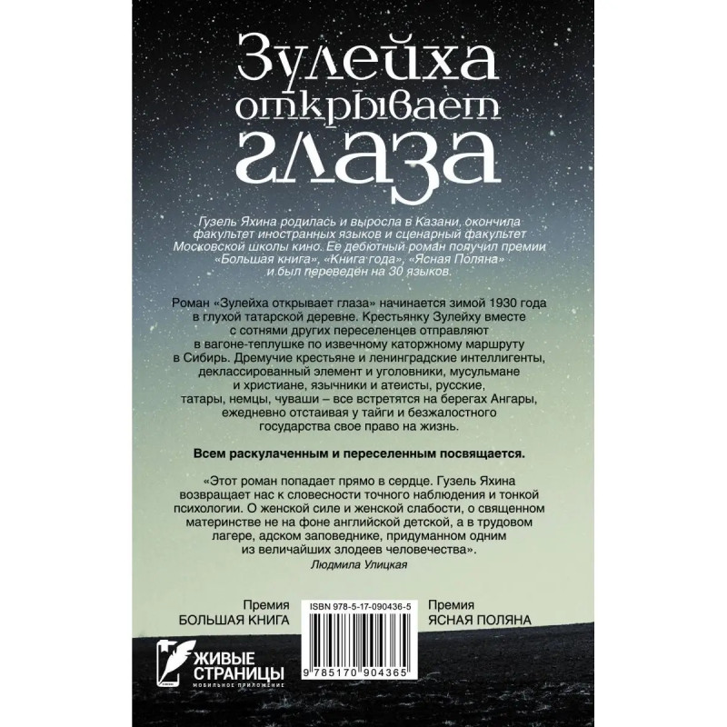 Гузель Яхина родилась и выросла в Казани, окончила факультет иностранных языков, учится на сценарном факультете Московской школы кино. Публиковалась в журналах "Нева", "Сибирские огни", "Октябрь". Роман "Зулейха открывает глаза" начинается зимой 193 года в глухой татарской деревне. Крестьянку Зулейху вместе с сотнями других переселенцев отправляют в вагоне-теплушке по извечному каторжному маршруту в Сибирь. Дремучие крестьяне и ленинградские интеллигенты, деклассированный элемент и уголовники, мусульмане и христиане, язычники и атеисты, русские, татары, немцы, чуваши все встретятся на берегах Ангары, ежедневно отстаивая у тайги и безжалостного государства свое право на жизнь. Всем раскулаченным и переселенным посвящается.