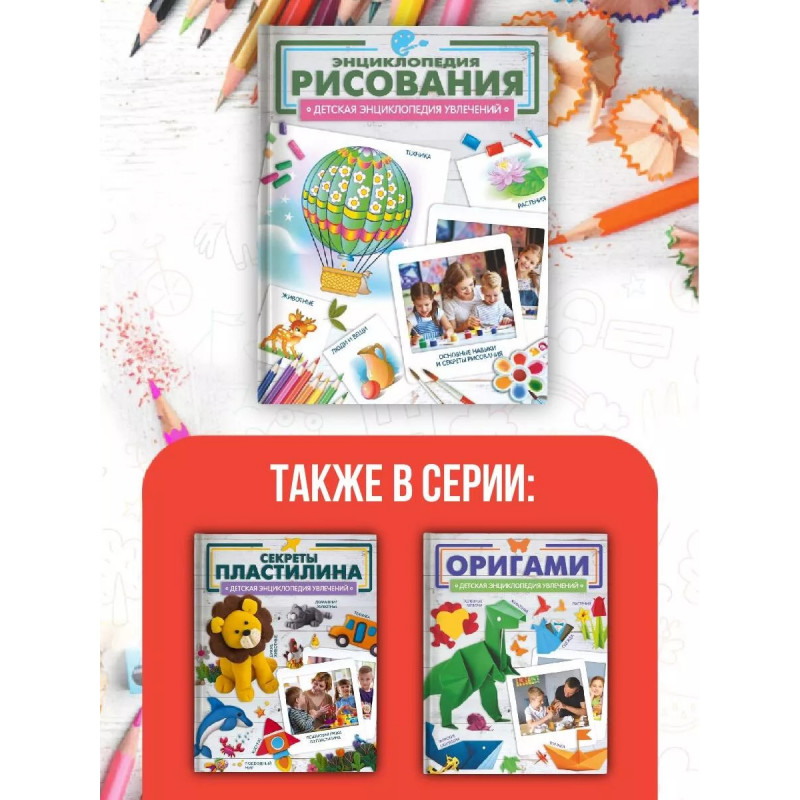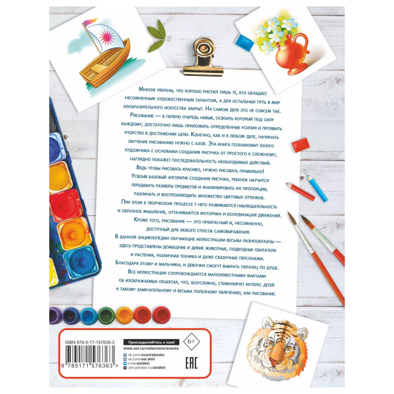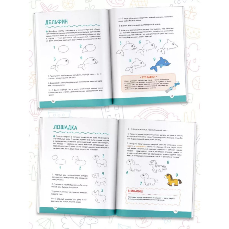 Энциклопедия рисования. Эта книга на практических примерах научит ребенка воплощать в рисунке любые художественные задумки, поэтапно покажет, как, опираясь на простые геометрические фигуры, построить основу изображения, а затем развить его деталями и в результате получить красивый, а главное, правильно выполненный рисунок. Рисование - прекрасный способ выразить свое мировосприятие, поделиться с окружающими собственными чувствами и эмоциями. Первые попытки приобщиться к миру прекрасного, отображая действительность в рисунке, каждый предпринимает еще в раннем детстве. Взрослея, ребята испытывают потребность в самовыражении, в том числе через изображение. Энциклопедия рисования поможет им в этом, обучив основам создания рисунка - от простого к сложному. Благодаря тому, что в качестве наглядных примеров используется очень широкий спектр объектов, объединенных в тематические разделы, издание будет интересно и мальчикам, и девочкам. Кроме того, юные художники узнают много интересного об окружающем мире, ведь каждая картинка сопровождается