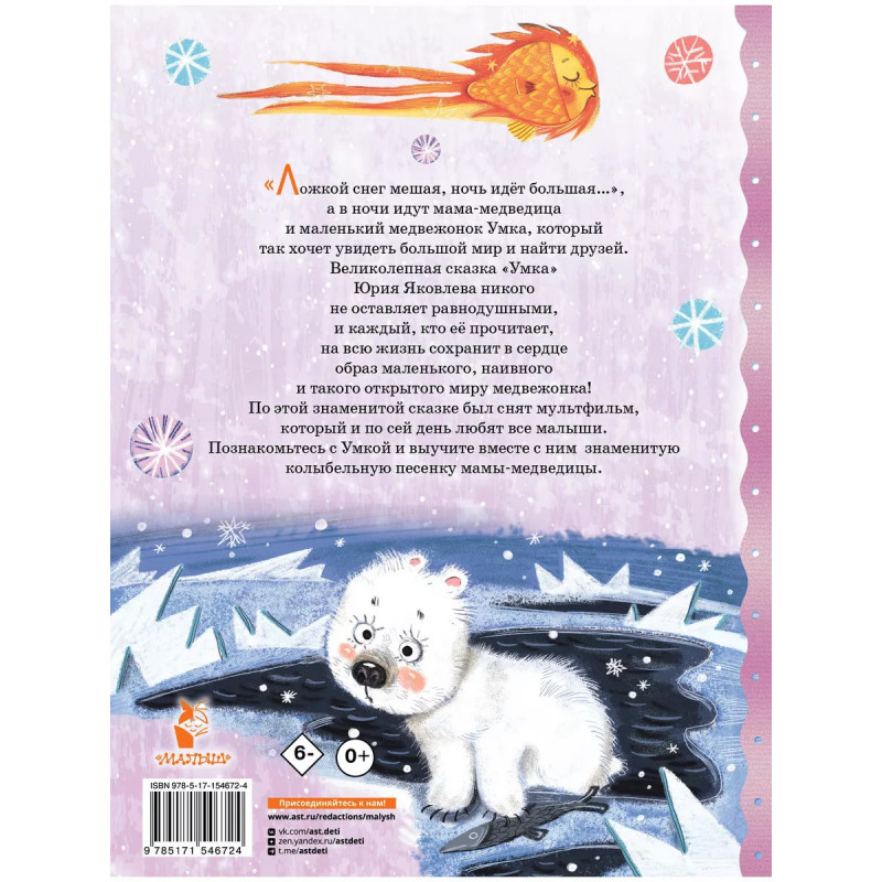 Умка. Сказка с песенкой. Ложкой снег мешая, ночь идёт большая ", а в ночи идут мама-медведица и маленький медвежонок Умка, который так хочет увидеть большой мир и найти друзей. Великолепная сказка "Умка" Юрия Яковлева никого не оставляет равнодушными, и каждый, кто её прочитает, на всю жизнь сохранит в сердце образ маленького, наивного и такого открытого миру медвежонка! По этой знаменитой сказке был снят мультфильм, который и по сей день любят все малыши. Познакомьтесь с Умкой и выучите вместе с ним знаменитую колыбельную песенку мамы-медведицы.
