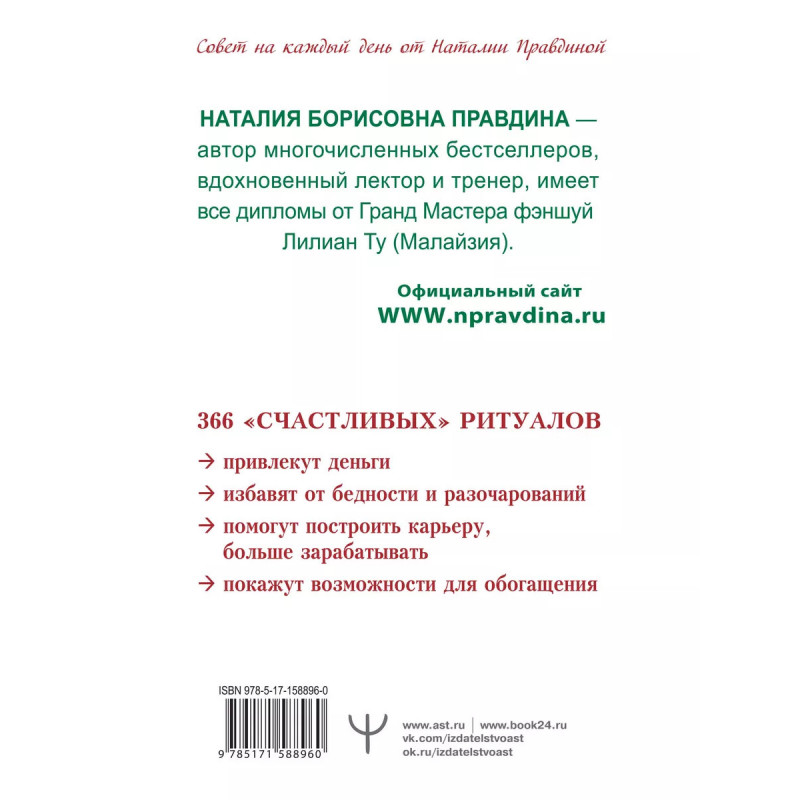 Календарь привлечения денег на 2024 год. 366 практик от Мастера. Лунный календарь. Календарь Наталии Правдиной даст вам 366 уникальных практик, которые сделают каждый день года денежным! Каждые две минуты в мире становится на трех миллионеров больше. Отчего бы и вам не вступить в их ряды? Денежный календарь сделает ваши действия на пути обретения богатства максимально эффективными. Сколько денег вам нужно? Вы уверены, что этого хватит? А как же мечты о доме за городом и кругосветном путешествии? Не стесняйтесь просить больше. У Вселенной благ хватит на всех. Главное - просить правильно и вовремя - по лунному календарю. В "Календаре привлечения денег на 224 год. 366 практик от Мастера. Лунный календарь" Наталии Правдиной вы найдете подробные рекомендации на каждый день предстоящего года, чтобы все шло как по маслу. Лунные практики позволяют направить течение событий в нужное русло и быть во всеоружии перед важными событиями.