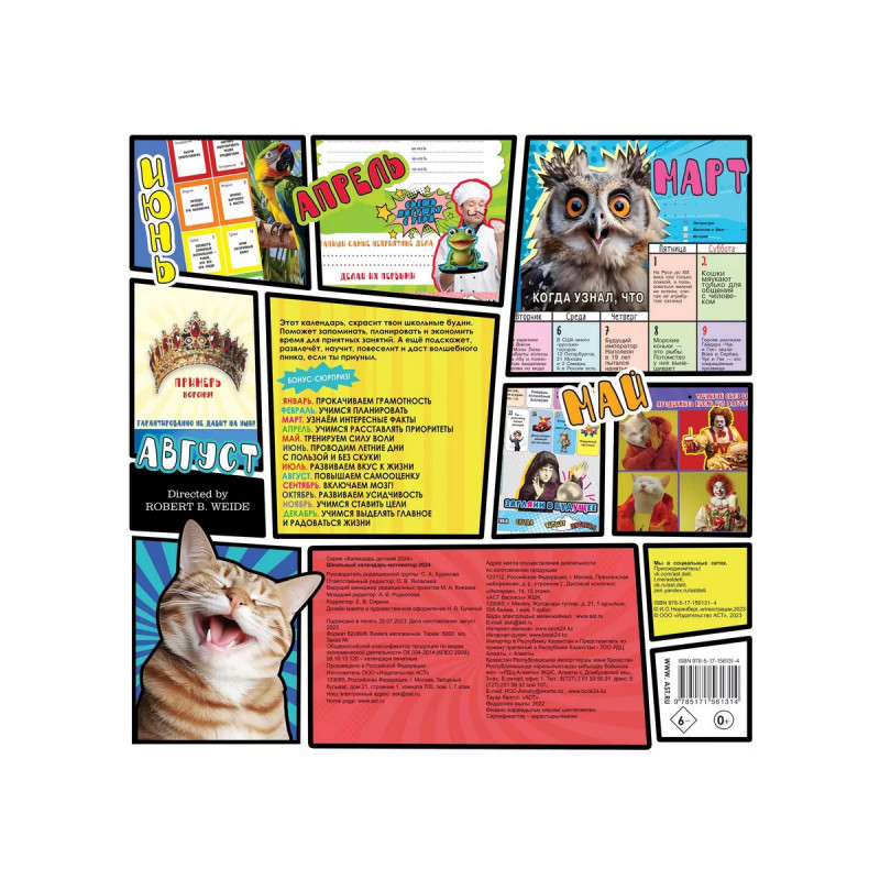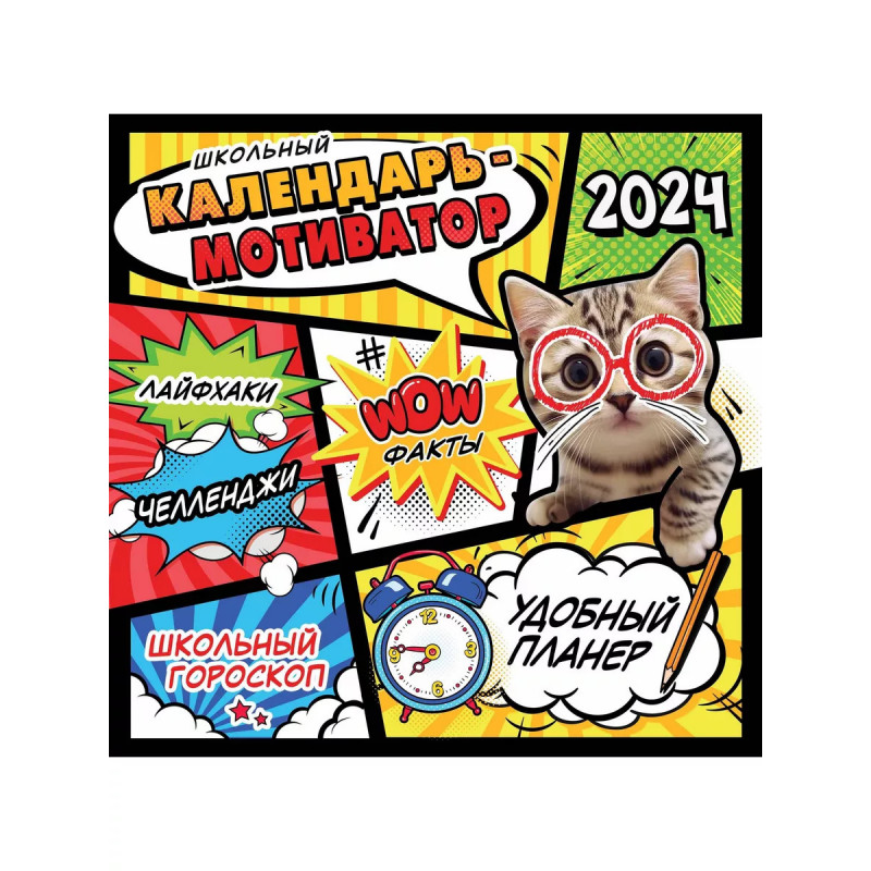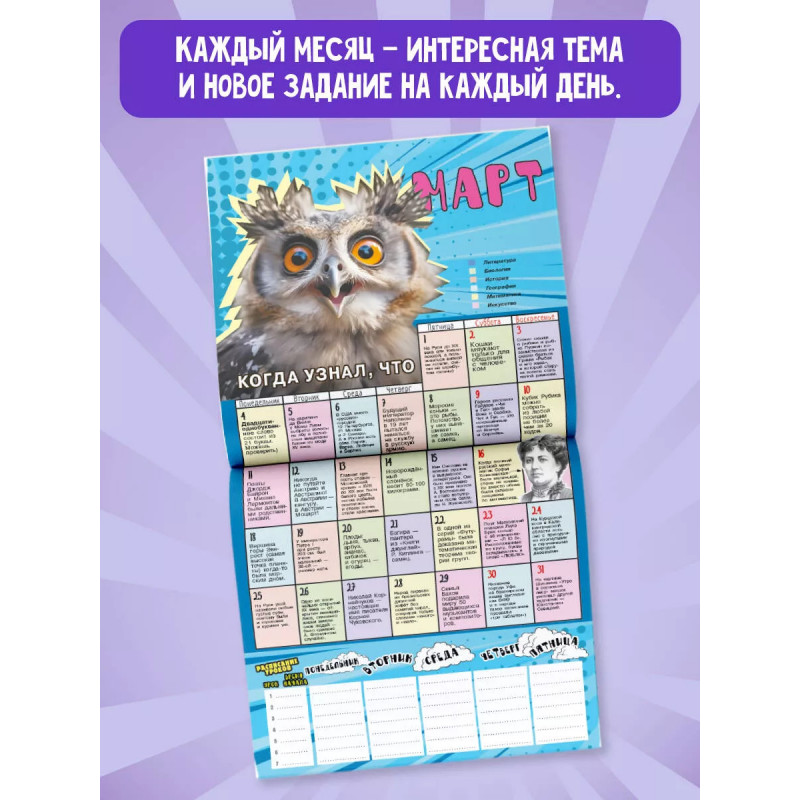 Школьный календарь-мотиватор. Троянский конь среди мотивирующих изданий для детей. Протаскивает полезные навыки в мир школьника без занудства и нравоучений. Под толстым слоем популярных мемов и забавных мотиваторов в календаре спрятаны: to do list для фиксации важных дел, полезные лайфхаки, развивающие задания, познавательные факты, правила орфографии, творческие челленджи. Каждый месяц - интересная тема и новое задание на каждый день. Календарь мотивирует детей к достижениям в учёбе и творчестве и учит планированию учёбы и досуга, самомотивации, выделению и формулировке основных фактов. По завершению года календарь становится памятным альбомом успехов.