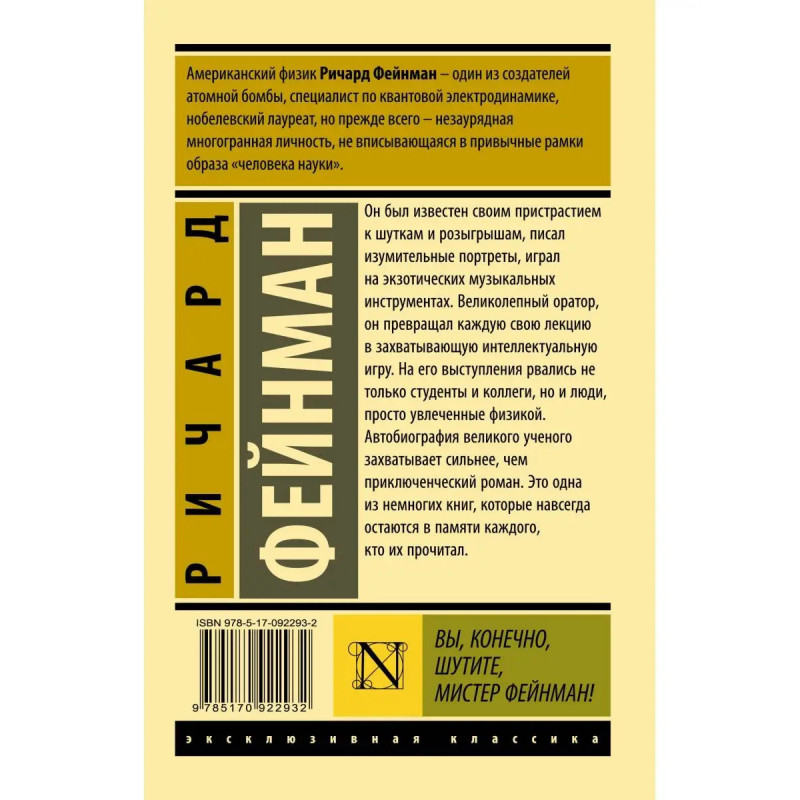 Он был известен своим пристрастием к шуткам и розыгрышам, писал изумительные портреты, играл на экзотических музыкальных инструментах. Великолепный оратор, он превращал каждую свою лекцию в захватывающую интеллектуальную игру. На его выступления рвались не только студенты и коллеги, но и люди, просто увлеченные физикой. Автобиография великого ученого захватывает сильнее, чем приключенческий роман. Это одна из немногих книг, которые навсегда остаются в памяти каждого, кто их прочитал.