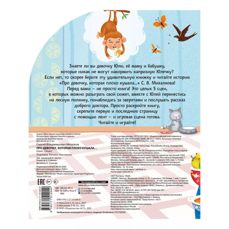 Про девочку, которая пл.оxо кушала.... Книга, которая поможет накормить даже самых упрямых малоежек! Знаете ли вы девочку Юлю, её маму и бабушку, которые никак не могут накормить капризную Юлечку? Если нет, то скорее берите эту удивительную книжку и читайте историю "Про девочку, которая пл.оxо кушала " С. В. Михалкова! Перед вами - не просто книга! Это целых 5 сцен, в которых можно разыграть свой сюжет, вместе с Юлей перенестись на лесную полянку, понаблюдать за зверятами и послушать рассказ доброго доктора. Просто раскройте книгу, скрепите первую и последнюю страницу с помощью лент - и игровая сцена готова. Читайте и играйте!