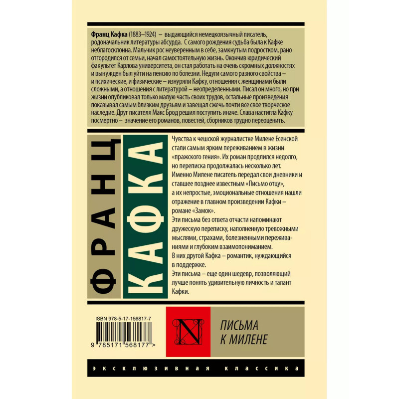 Письма к Милене. Чувства к чешской журналистке Милене Есенской стали самым ярким переживанием в жизни "пражского гения". Их роман продлился недолго, но переписка продолжалась несколько лет. Именно Милене писатель передал свои дневники и ставшее позднее известным "Письмо отцу", а их непростые, эмоциональные отношения нашли отражение в главном произведении Кафки - романе "Замок". Эти письма без ответа отчасти напоминают дружескую переписку, наполненную тревожными мыслями, страхами, болезненными переживаниями и глубоким взаимопониманием. В них - другой Кафка, - романтик, нуждающийся в поддержке. Эти письма - еще один шедевр, позволяющий лучше понять удивительную личность и талант Кафки.