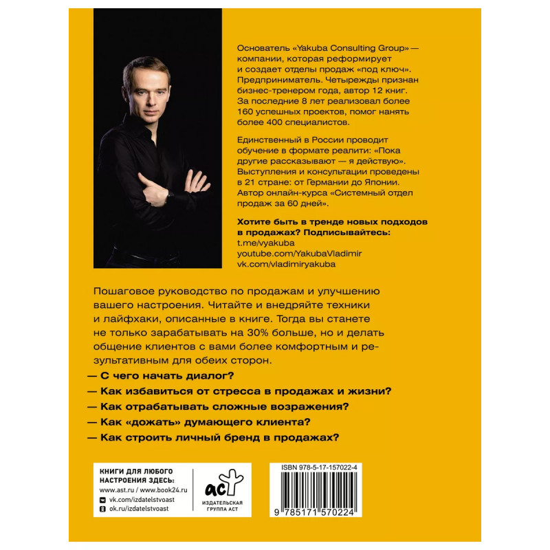 Продажник на всю голову 2.0. Владимир Якуба - Продажник с большой буквы, лучший спикер по продажам в России и СНГ. Его выступления признаются самыми заряженными и содержательными. Методы Владимира Якубы - простые, понятные, много раз отработанные на практике. Владимир учит продавать на любом уровне и на любых площадках: гендиректору и рядовому менеджеру, по телефону и "в полях". В новом переработанном издании бестселлера Владимир собрал самые крутые стратегии. Вы станете не только зарабатывать на 3% больше, но и делать общение клиентов с вами более комфортным и результативным для обеих сторон. Пошаговое руководство по продажам: С чего начать диалог? Как избавиться от стресса в продажах и жизни? Как отрабатывать сложные возражения? Как "дожать" думающего клиента? Как строить личный бренд в продажах?
