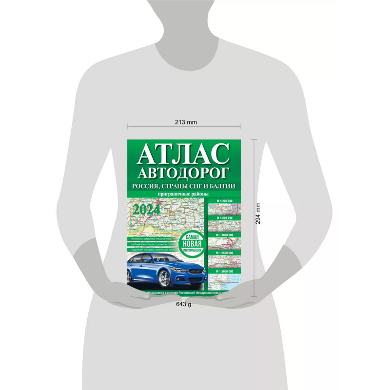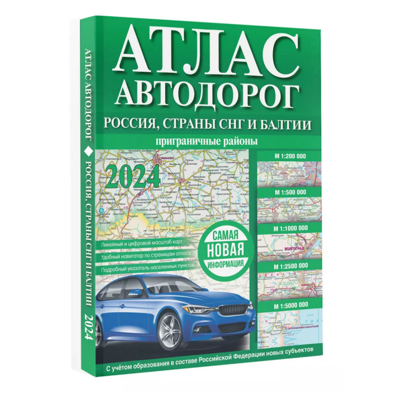 Атлас автодорог России, стран СНГ и Балтии (приграничные районы) (в новых границах). Атлас включает автодорожные карты масштабов 1:200 000, 1:500 000, 1:1 000 000, 1:2 500 000 и 1:5 000 000 на территорию России, стран СНГ и Балтии (приграничные районы), составленные с привлечением топографических материалов и статистических данных. В конце атласа имеется подробный указатель названий населённых пунктов. На картах Атласа показаны автомобильные дороги с различным покрытием, выделены дороги федерального значения, указаны расстояния между населенными пунктами и точками пересечения дорог, даны другие полезные сведения. Россия представлена в новых границах: с Донецкой и Луганской Народными республиками, Запорожской и Херсонской областями, Республикой Крым и Севастополем.