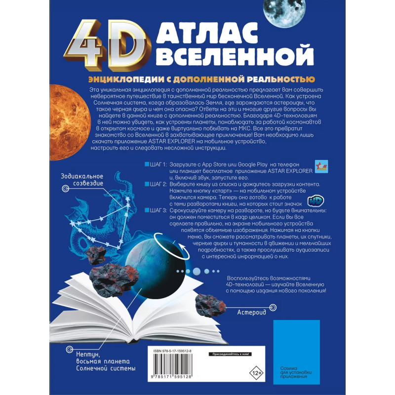 Вселенная бесконечна и многообразна. С древних времен она привлекала внимание людей своими загадками. Сперва они научились строить обсерватории для наблюдения за звездами, Солнцем и Луной, потом начали составлять астрономические календари, карты звездного неба и макеты Вселенной, размещая на них различные космические объекты, видимые с Земли невооруженным глазом. Наконец были изобретены телескопы, которые произвели настоящую революцию в астрономии. А много позже, уже в ХХ в., вооружившись научными знаниями, человек смог осуществить свою давнюю мечту и отправился в космос. Об истории исследования космического пространства вы узнаете из этой уникальной энциклопедии с дополненной реальностью, посвященной нашей Вселенной. Вы отправитесь в виртуальное путешествие по бескрайним просторам космоса и понаблюдаете за его объектами в цвете, объеме и движении. А еще сможете прослушать познавательные звукозаписи, где приводится множество любопытных фактов.