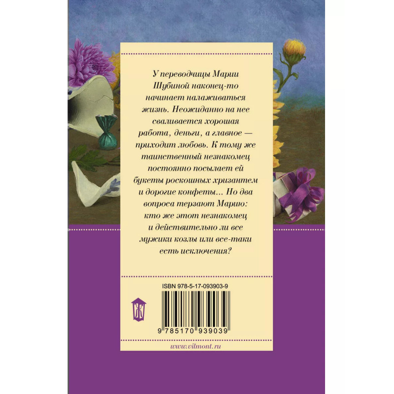 Полоса везения, или все мужики козлы. У переводчицы Марии Шубиной наконец-то начинает налаживаться жизнь. Неожиданно на нее сваливается хорошая работа, деньги, а главное - приходит любовь. К тому же таинственный незнакомец постоянно посылает ей букеты роскошных хризонтем и дорогие конфеты... Но два вопроса терзают Марию: кто же этот незнакомец и действительно ли все мужики козлы или все-таки есть исключения?