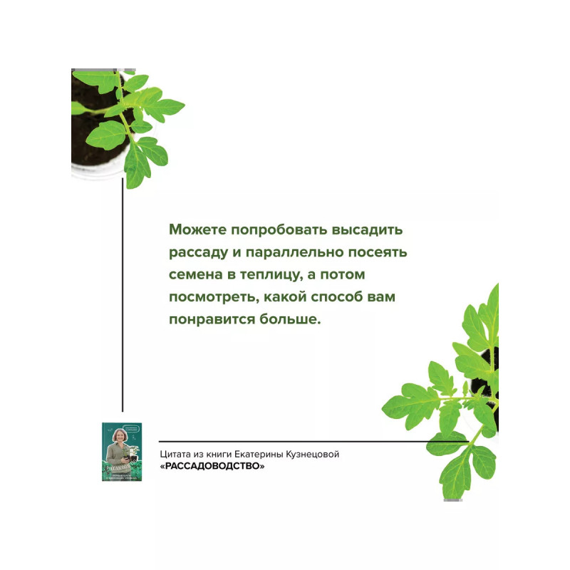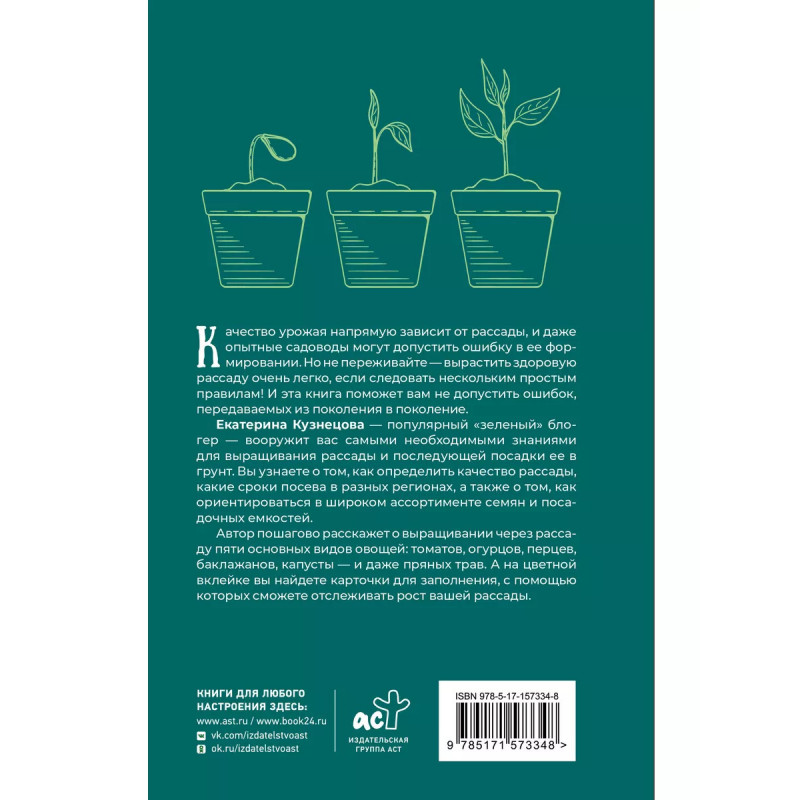 Рассадоводство. Первые шаги к здоровому урожаю. Готовь сани летом, а рассаду - зимой. Настоящие огородники знают, что готовиться к дачному сезону нужно заранее. Чтобы подготовка прошла проще, а урожай получился богаче, готовьтесь вместе с новой книгой профессионального биолога, садовода с 10-летним опытом, и популярного блогера Екатерины Кузнецовой "Рассадоводство".Екатерина подробно ответит на самые "наболевшие" вопросы дачников о том, как правильно выращивать рассаду: когда пора сеять, какои грунт выбрать, какие горшки удобнее, какие семена купить... Вместе с книгой Екатерины вы разберетесь в таких нюансах "рассадоводства" как: выбор качественного грунта и семян, дополнительное освещение, температурный режим, замачивание и пересадка, которые помогут получить здоровую и крепкую рассаду к тому моменту, как придет пора высаживать ее в грунт. В книге вы узнаете о выращивании через рассаду пяти видов овощеи: томатов, огурцов, перцев, баклажанов и капусты, а также о выращивании пряных трав. Откройте секреты выращивания здоровой и крепкой рассады вместе с кни