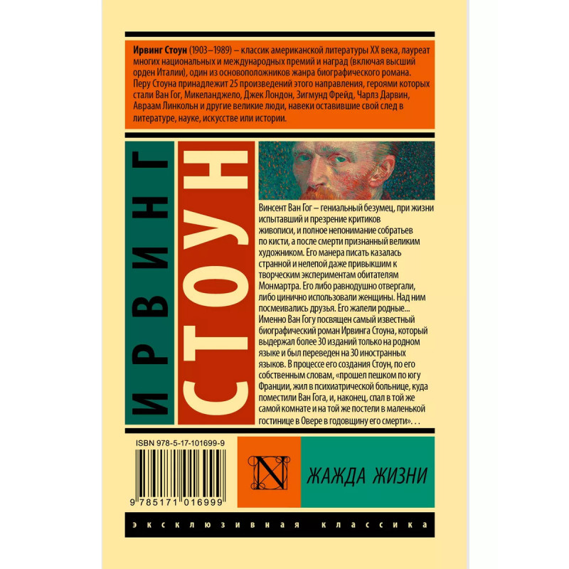 Жажда жизни. Винсент Ван Гог - гениальный безумец, при жизни испытавший и презрение критиков живописи, и полное непонимание собратьев по кисти, а после смерти признанный великим художником. Его манера писать казалась странной и нелепой даже привыкшим к творческим экспериментам обитателям Монмартра. Его либо равнодушно отвергали, либо цинично использовали женщины. Над ним посмеивались друзья. Его жалели родные... Именно Ван Гогу посвящен самый известный биографический роман Ирвинга Стоуна, который выдержал более 30 изданий только на родном языке и был переведен на 30 иностранных языков. В процессе его создания Стоун, по его собственным словам, "прошел пешком по югу Франции, жил в психиатрической больнице, куда поместили Ван Гога, и, наконец, спал в той же самой комнате и на той же постели в маленькой гостинице в Овере в годовщину его смерти"