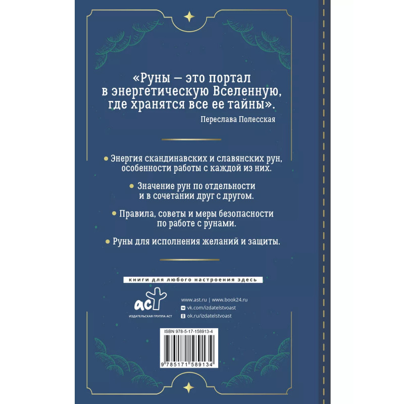 Руны. Понятный самоучитель по работе с магическим алфавитом. Скандинавская и славянская традиции. В книге раскрываются тайны, которые хранят в себе руны. Это древняя магия, подвластная лишь немногим. Теперь и вы сможете считывать энергию символов, использовать их как инструмент для исполнения желаний и защиты, обучиться рунной грамоте и практикам, необходимым для гадания. Автор дает двойную интерпретацию рун: классическую скандинавскую и славянскую, которая не так известна и распространена. Руны разных народов, несмотря на совпадение символов, несут разную энергетику. Основная сила и магия рун по большей части находится в слове, которым ее активируют. Здесь вы найдете скандинавские и славянские имена рун, их сходства и различия. Узнаете, что стоит за каждой руной, из чего складываются разные информационные слои и как они раскрываются при работе с ними. Переслава сама прошла путь от скептика до практика рунной магии. На основе личного опыта, своих собственных ощущений от рун она рассказывает про их сходства и различия. Какая энергия хранится в каждой из них, какие руны ближе к нам. На что они способны, как