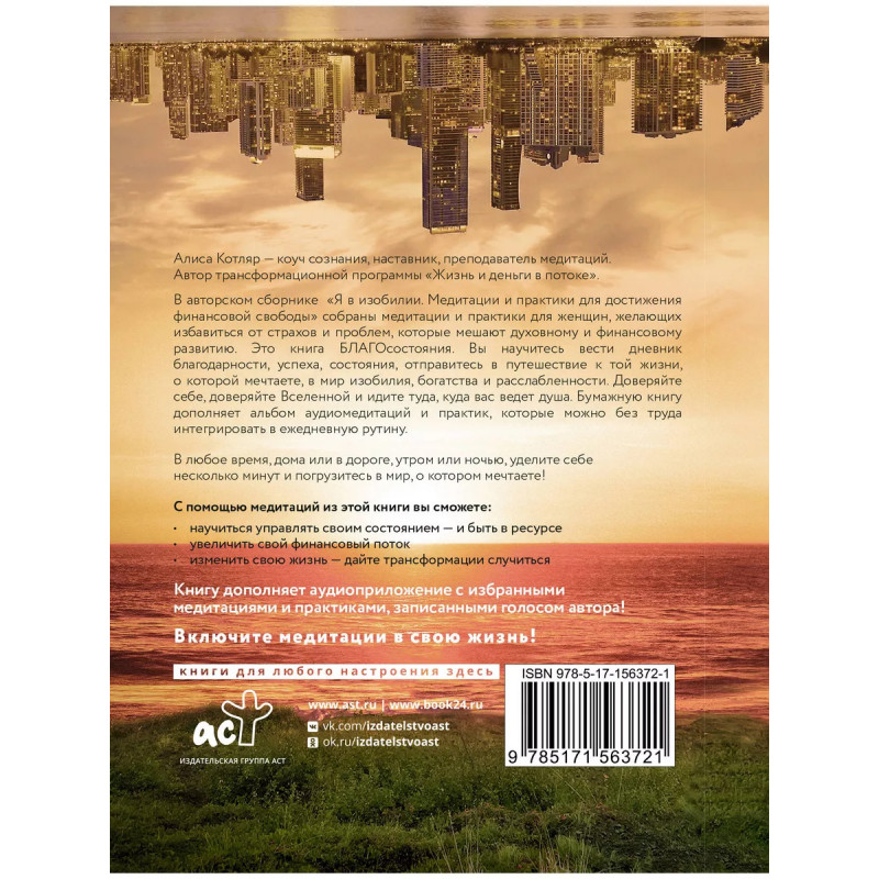 Я в изобилии. Медитации и практики для достижения финансовой свободы. Алиса Котляр - коуч сознания, наставник, преподаватель медитаций. Автор трансформационной программы "Жизнь и деньги в потоке". В авторском сборнике " Я в изобилии. Медитации и практики для достижения финансовой свободы" собраны медитации и практики для женщин, желающих избавиться от страхов и проблем, которые мешают духовному и финансовому развитию. Это книга БЛАГОсостояния. Вы научитесь вести дневник благодарности, успеха, состояния, отправитесь в путешествие на пути к той жизни, о которой мечтаете, в мир изобилия, богатства и расслабленности. Доверяйте себе, доверяйте Вселенной и идите туда, куда вас ведет душа. Бумажную книгу дополняет альбом аудиомедитаций и практик, которые можно без труда интегрировать в ежедневную рутину. В любое время, дома или дороге, утром или ночью, уделите себе несколько минут и погрузитесь в мир, о котором мечтаете! С помощью медитаций из этой книги вы сможете: " научиться управлять своим состоянием - и быть в ресурсе " увеличить свой финансовый поток " изменить свою жизнь - дайт