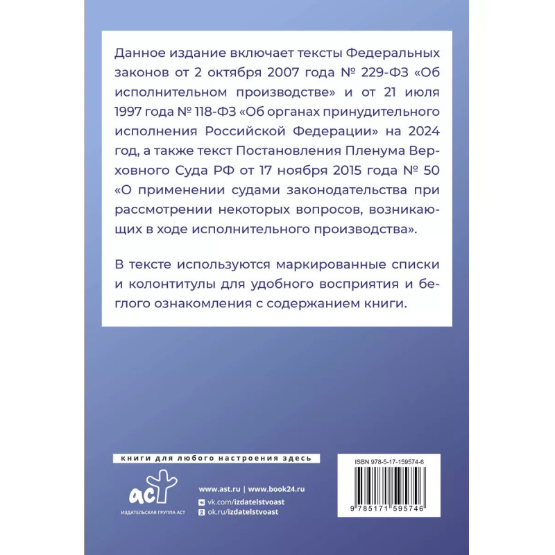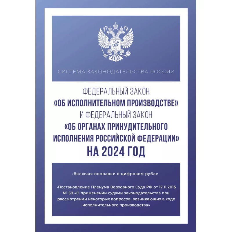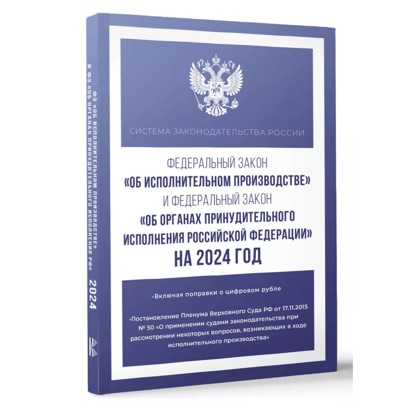 Федеральный закон "Об исполнительном производстве" и Федеральный закон "Об органах принудительного и. Данное издание включает тексты Федеральных законов от 2 октября 2007 года № 229-ФЗ "Об исполнительном производстве" и от 21 июля 1997 года № 118-ФЗ "Об органах принудительного исполнения Российской Федерации" на 2024 год, а также текст Постановления Пленума Верховного Суда РФ от 17 ноября 2015 года № 50 "О применении судами законодательства при рассмотрении некоторых вопросов, возникающих в ходе исполнительного производства". В тексте используются маркированные списки и колонтитулы для удобного восприятия и беглого ознакомления с содержанием книги. Издание учитывает все изменения, опубликованные в официальных источниках на момент подписания издания в печать.