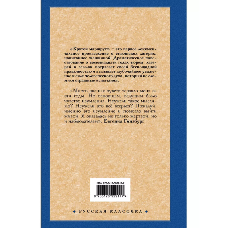 Крутой маршрут. Хроника времен культа личности. "Крутой маршрут" - это первое документальное произведение о сталинских лагерях, написанное женщиной. Драматическое повествование о восемнадцати годах тюрем, лагерей и ссылок потрясает своей беспощадной правдивостью и вызывает глубочайшее уважение к силе человеческого духа, который не сломили страшные испытания. "Много разных чувств терзало меня за эти годы. Но основным, ведущим было чувство изумления. Неужели такое мыслимо? Неужели это всё всерьез? Пожалуй, именно это изумление и помогло выйти живой. Я оказалась не только жертвой, но и наблюдателем". Евгения Гинзбург