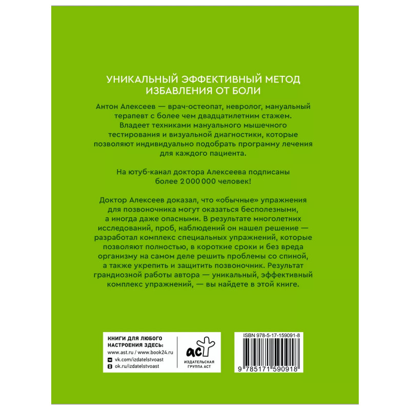 Благодарный позвоночник. Как навсегда избавить его от боли. Домашняя кинезиология. 3-е издание. Антон Алексеев - опытнейший врач-остеопат, невролог, мануальный терапевт. На его ютуб-канал подписано более двух миллионов человек! Доктор Алексеев доказал, что "обычные" упражнения для позвоночника могут оказаться бесполезными, а иногда даже опасными при некоторых заболеваниях. В результате многолетних исследований, проб, наблюдений он нашел решение - разработал комплекс специальных упражнений, которые позволяют полностью, в короткие сроки и без вреда организму на самом деле решить проблемы со спиной, а также укрепить и защитить позвоночник. Результат грандиозной работы автора, уникальный, эффективный комплекс упражнений, вы найдете в книге. Прочитав книгу, вы узнаете: " какие существуют способы избавиться от грыжи позвоночника; " как продолжительность жизни зависит от правильного дыхания; " как избавиться от головной боли и боли в пояснице, научившись правильно сидеть, стоять. Особенность этого уникального комплекса в том, что вы сможете подобрать упражнения, которые помогут именно вам оставаться здоровым и