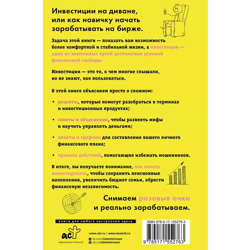 Инвестиции на диване. Основы инвестирования. Инвестиции на диване, или как новичку начать зарабатывать на бирже. Задача этой книги - показать вам возможность более комфортной и стабильной жизни, а инвестиции - один из возможных путей достижения условий финансовой свободы. Инвестиции - это то, о чем многие слышали, но не знают, как пользоваться. В этой книге объясняем просто о сложном: " рецепты, которые помогут разобраться в терминах и инвестиционных продуктах; " советы и объяснения, чтобы развеять мифы и научить управлять деньгами; " анкеты и графики для составления вашего личного финансового плана; " правила действий, помогающие избежать мошенников. В итоге, вы получаете понимание КАК начать инвестировать, чтобы сохранить пенсионные накопления, увеличить бюджет семьи, обрести финансовую независимость. Снимаем розовые очки и реально зарабатываем.