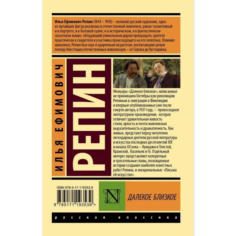 Далекое близкое. Мемуары "Далекое близкое", написанные не принявшим Октябрьскую революцию Репиным в эмиграции в Финляндии и впервые опубликованные уже после смерти автора, в 1937 году, - превосходное литературное произведение, которое отличает удивительная живость стиля, яркость и почти живописная выразительность и драматичность. Как живые, предстают перед читателем легендарные деятели русской литературы и искусства последних десятилетий XIX и начала ХХ века - Куинджи и Толстой, Крамской, Васильев и Ге. Отдельный интерес представляют колоритные и трогательные главы, посвященные истории создания наиболее известных работ Репина и эмоциональные "Письма об искусстве".