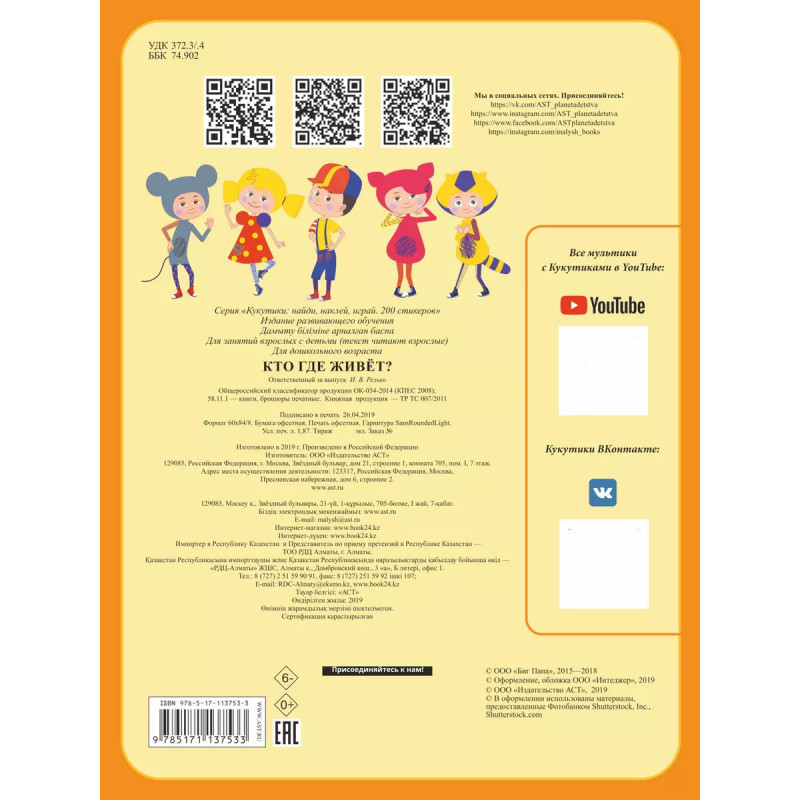 Кукутики это полюбившиеся всем детям герои одноимённого музыкального канала на YouTube, собравшего миллионы просмотров и подписчиков в сети Интернет. Вместе с ними на страницах книги "Кто где живёт" малыши повстречают знакомых персонажей любимых мультфильмов, подружатся с разными животными и узнают, где они живут. А ещё выполнят увлекательные задания и поиграют с яркими наклейками. Присоединяйтесь к весёлой компании Кукутиков! Для дошкольного возраста.